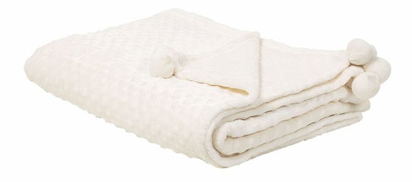 Teplá a měkká deka je dokonalým bytovým doplňkem, který dodá útulnost každému interiéru. Je vyrobena z materiálu příjemného na dotek se strukturou v jemně vypouklých tečkách, její okraje jsou zdobeny bambulkami, které jí dodávají neobvyklé kouzlo. Tato praktická deka také poslouží jako přikrývka na postel či pohovku.