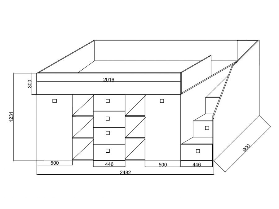 šest otevřených polic na přední části postele