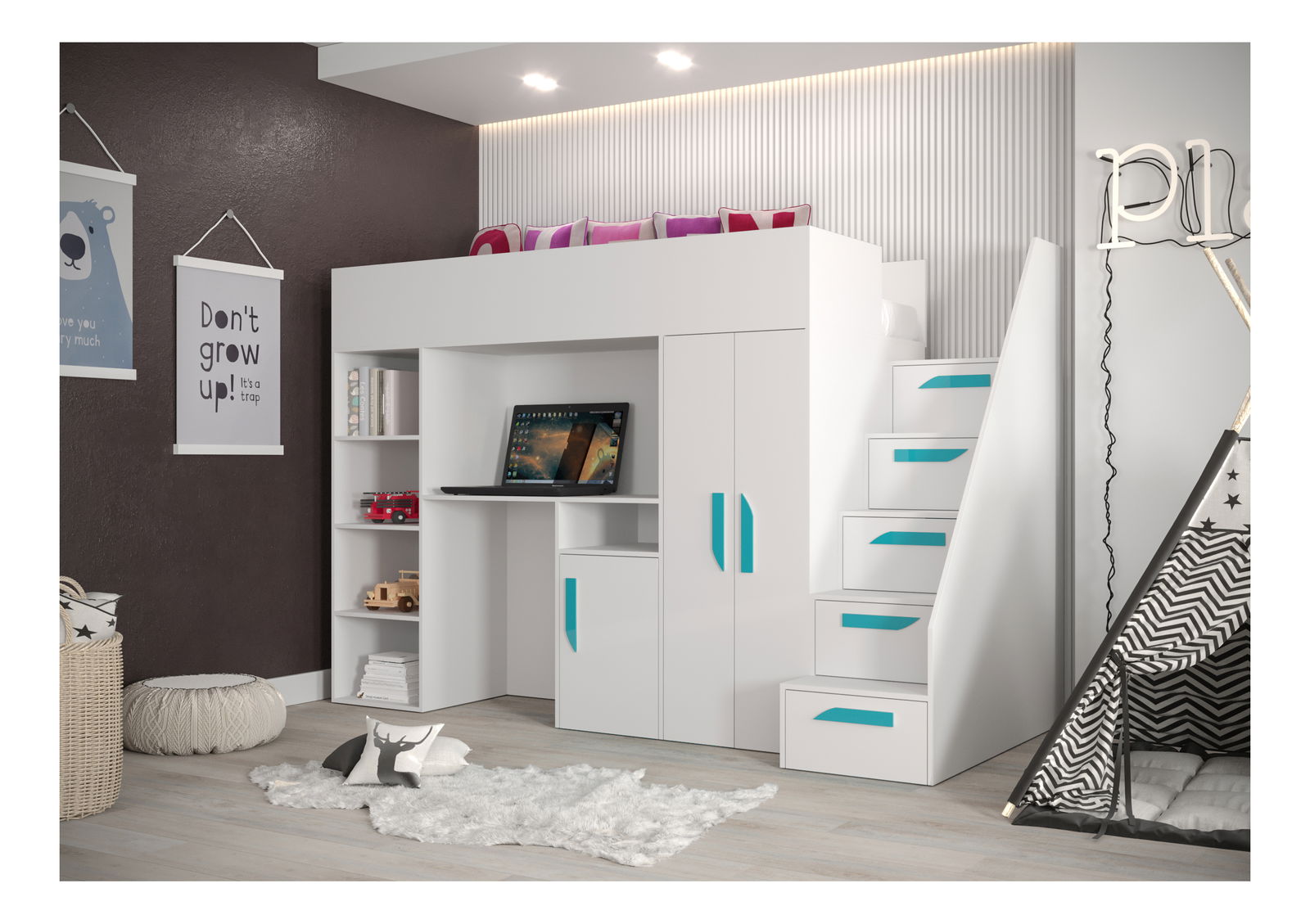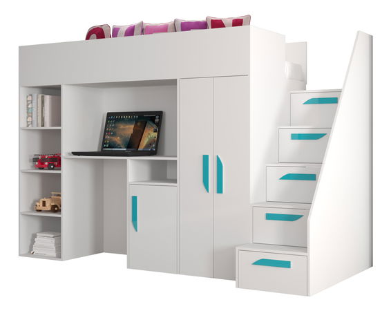 Dětská kombinovaná postel 90 cm Puro 14 (matná bílá + bílý lesk + tyrkysové úchytky)