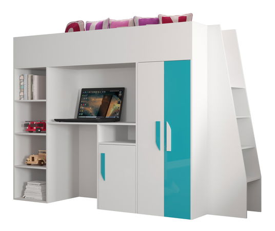 Dětská kombinovaná postel 90 cm Puro 15 (matná bílá + bílý lesk + tyrkysový lesk)