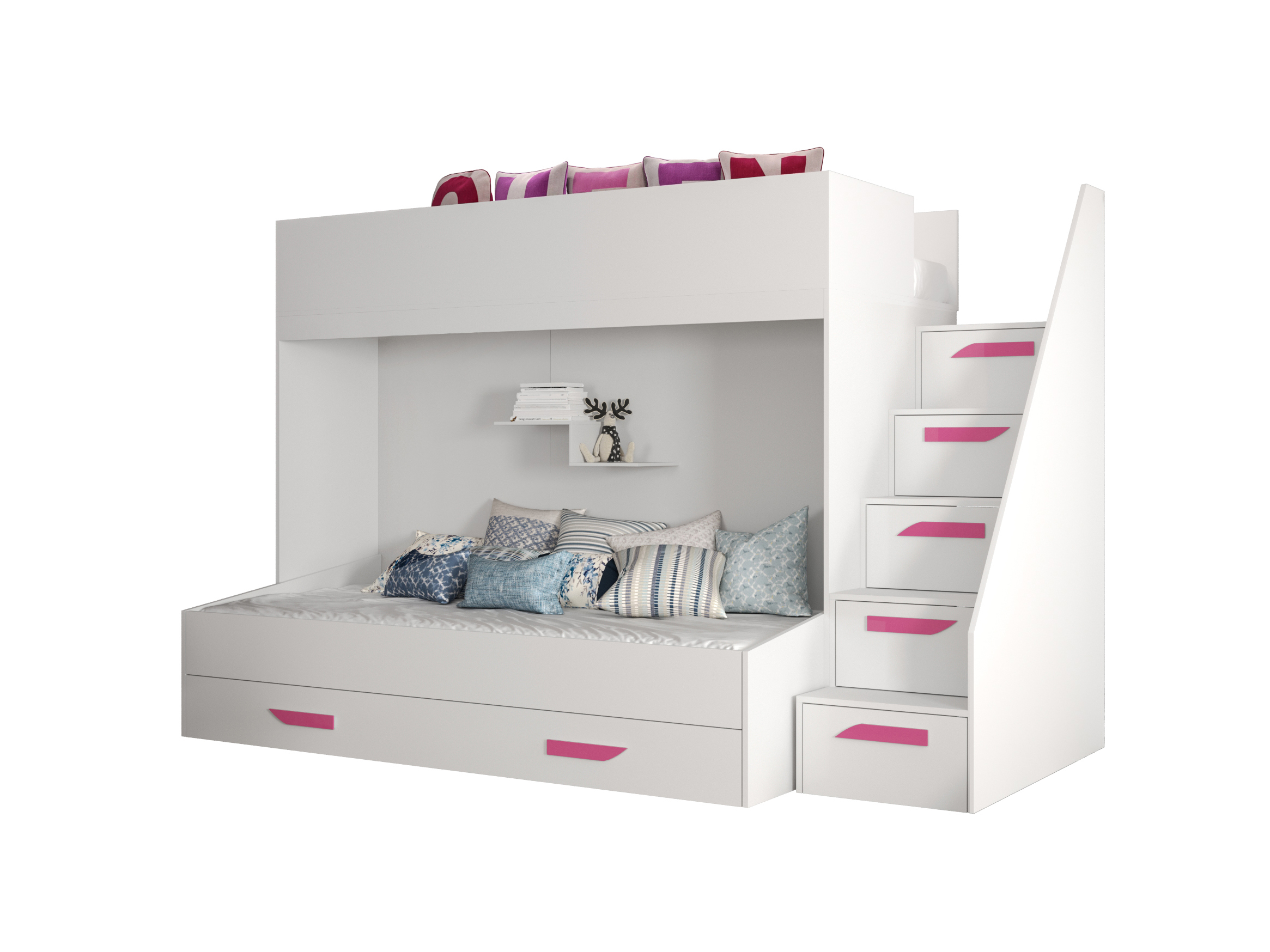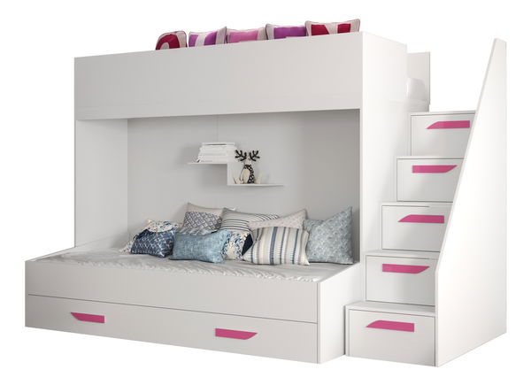 Dětská kombinovaná postel 90 cm Puro 16 (matná bílá + bílý lesk + růžové úchytky)