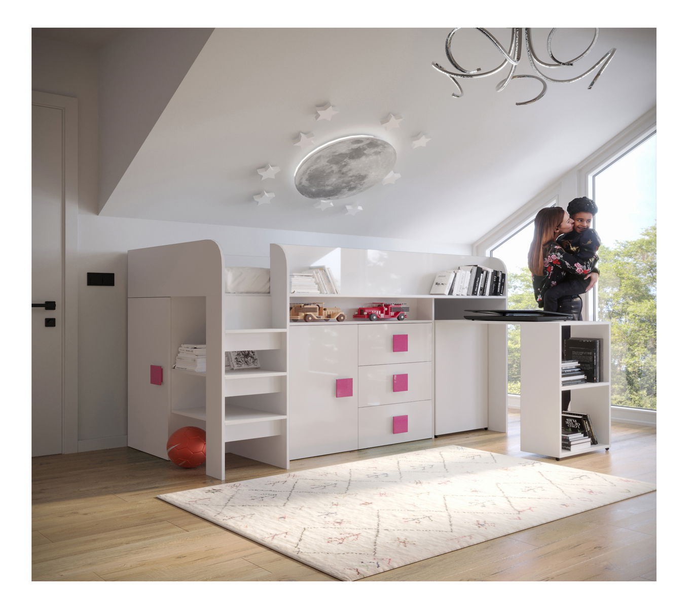 Dětská kombinovaná postel 90 cm Toreno 1 (bílá + bílý lesk + růžová lesklá madla)