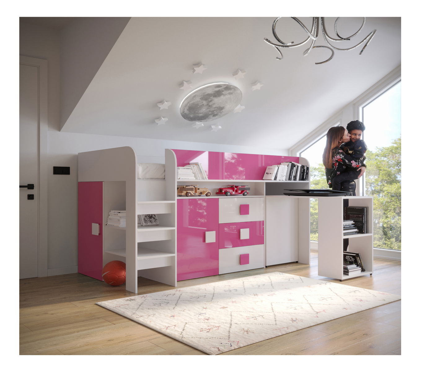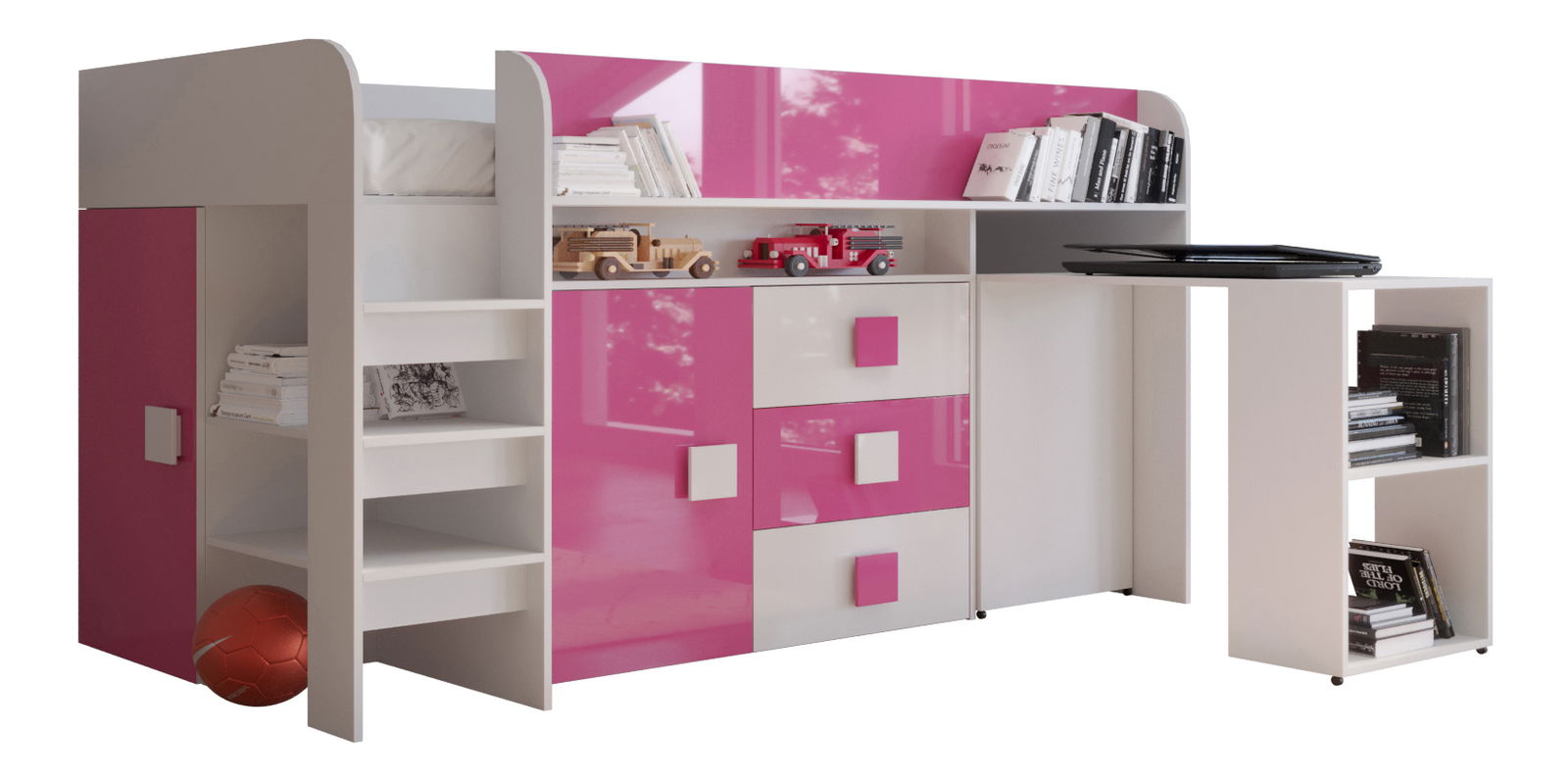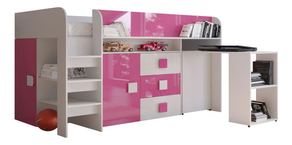 Dětská kombinovaná postel 90 cm Toreno 1 (bílá + bílý lesk + růžový lesk)