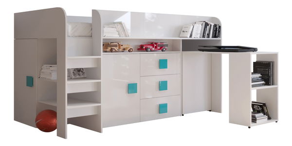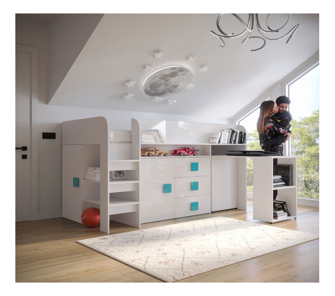 Dětská kombinovaná postel 90 cm Toreno 1 (bílá + bílý lesk + tyrkysová lesklá madla)