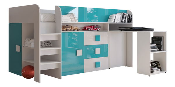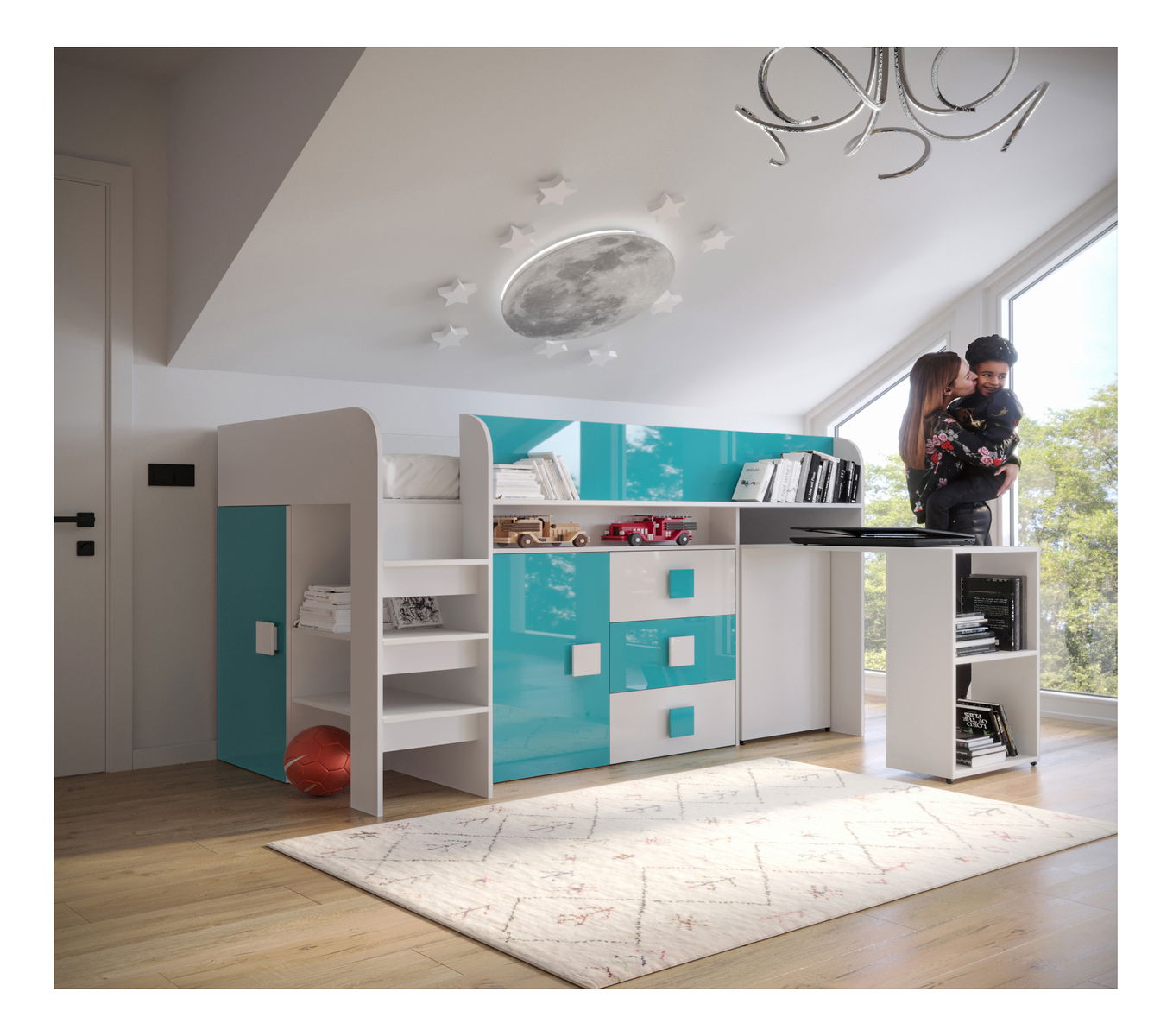 Dětská kombinovaná postel 90 cm Toreno 1 (bílá + bílý lesk + tyrkysový lesk)