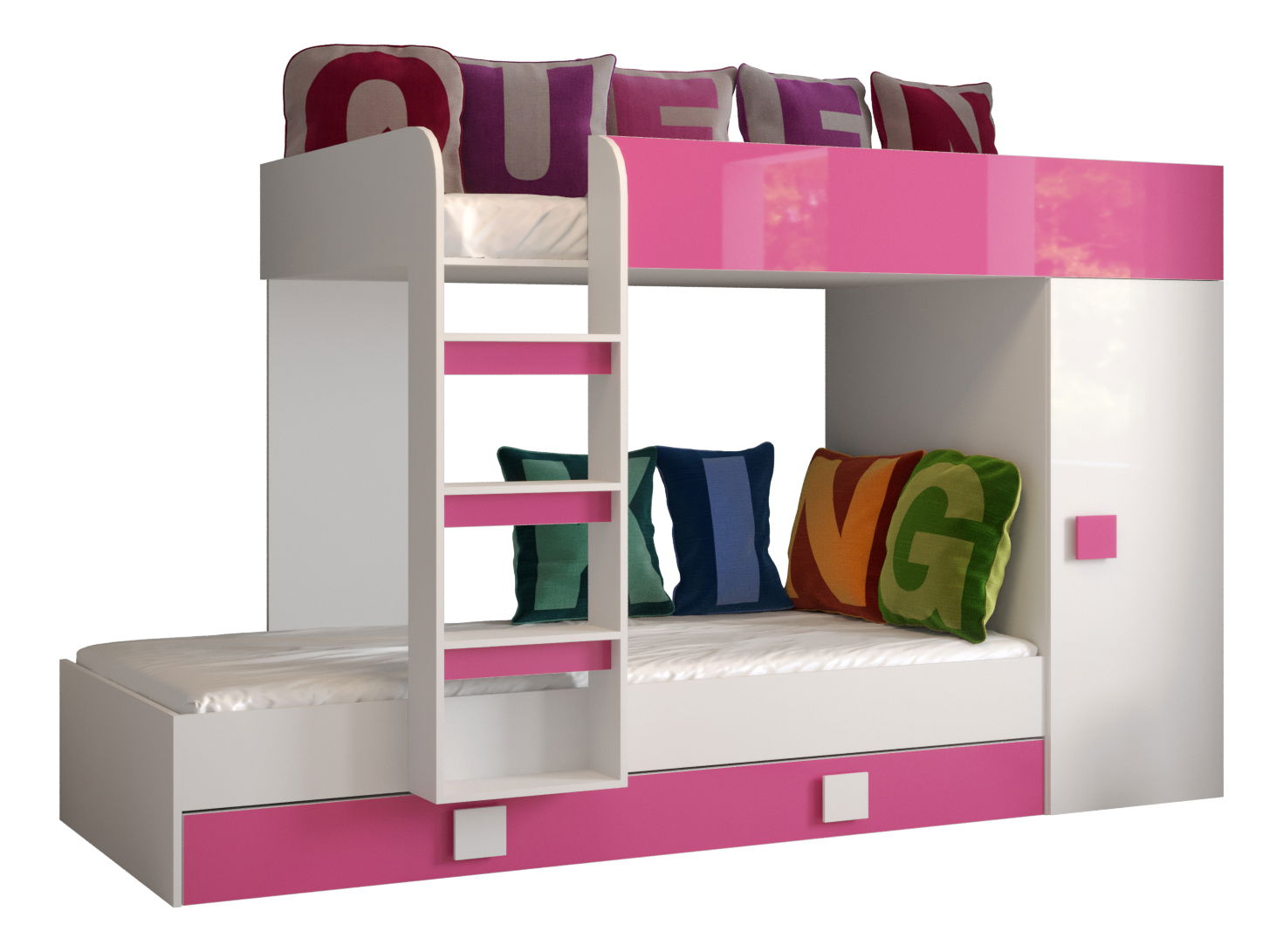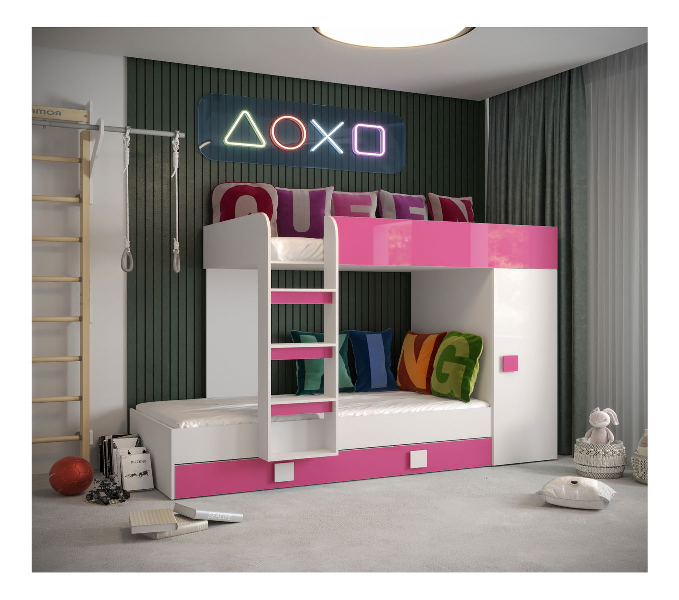 Dětská kombinovaná postel 90 cm Toreno 2 (bílá + bílý lesk + růžový lesk)