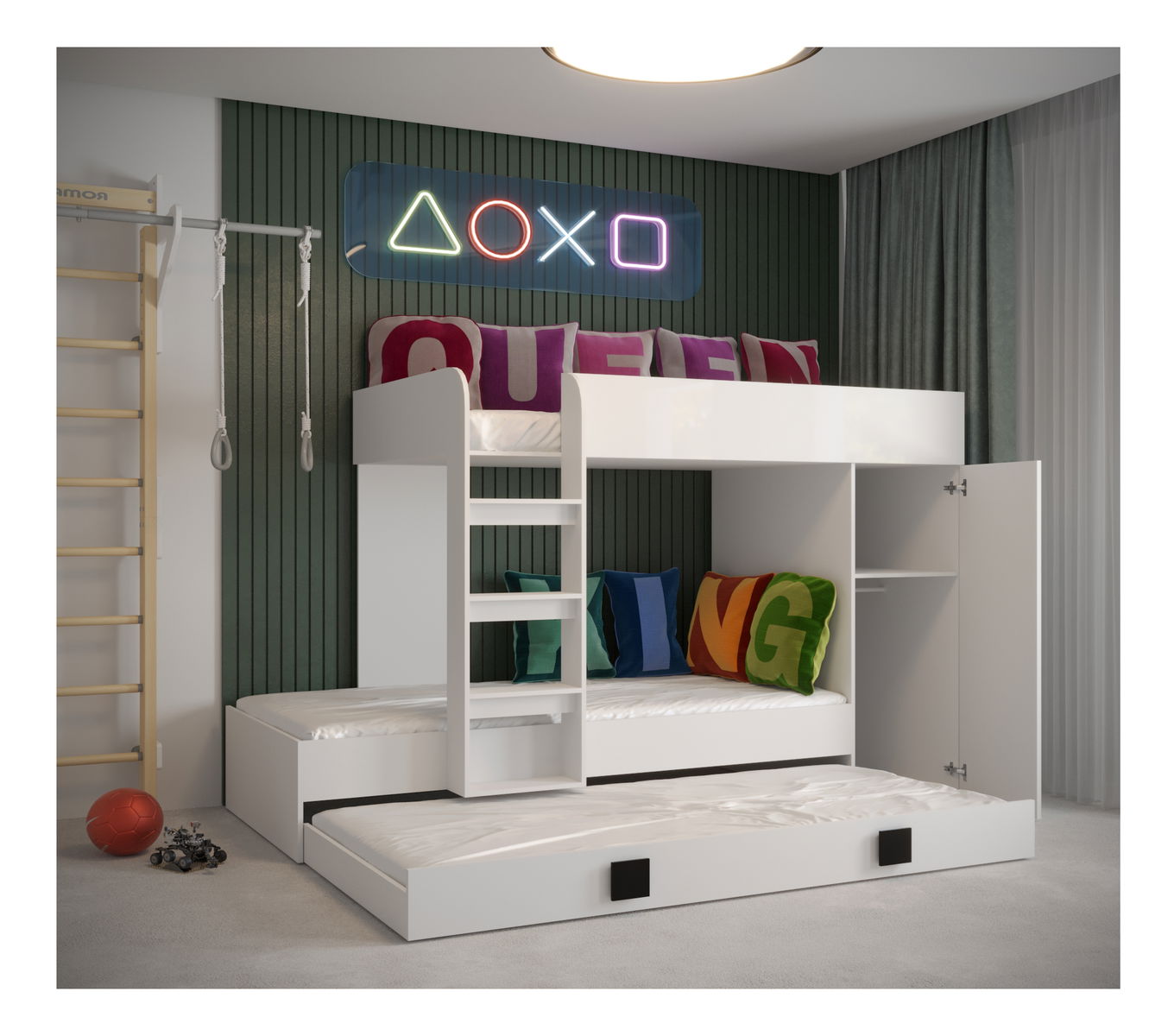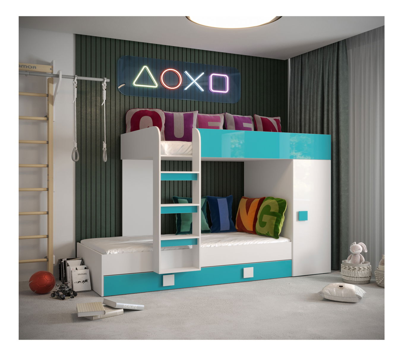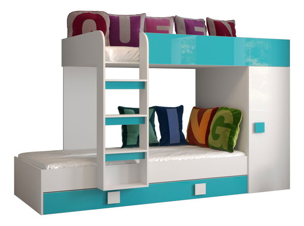 Dětská kombinovaná postel 90 cm Toreno 2 (bílá + bílý lesk + tyrkysový lesk)