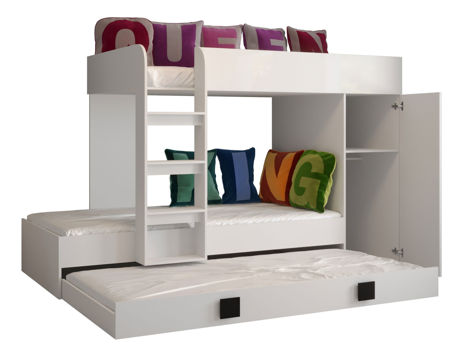 90x200cm (horní spací plocha) a 85x200cm (střední a spodní spací plocha) - pěnové s max. výškou 8cm nebo pružinové o max. výškou 12cm - nejsou součástí dodávky