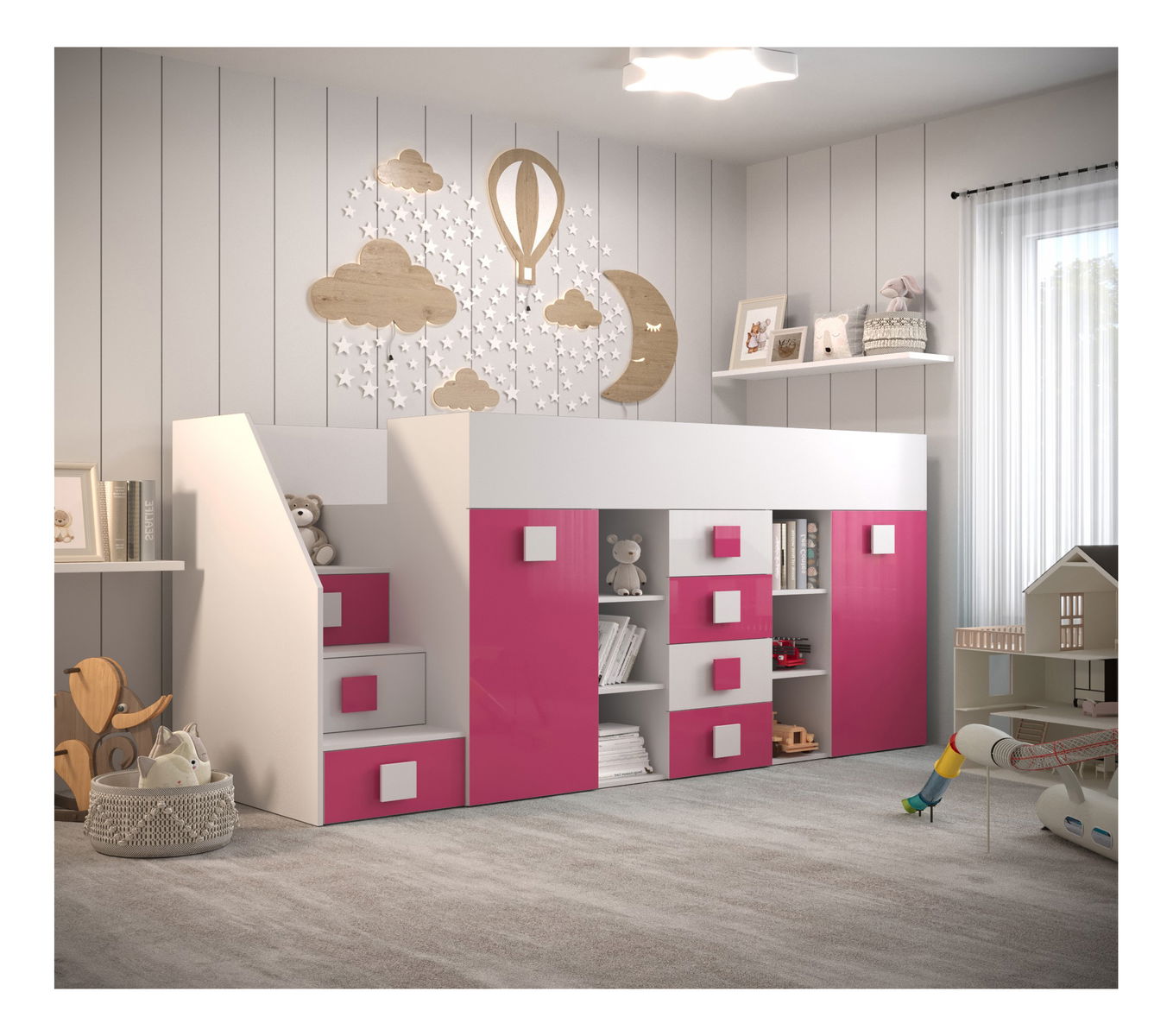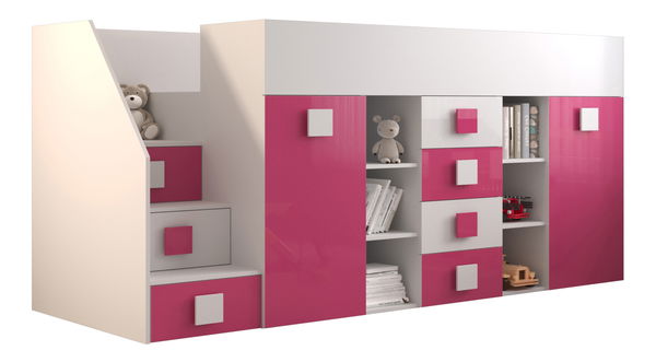 Dětská kombinovaná postel 90 cm Toreno 3 (bílá + bílý lesk + růžový lesk) (L)