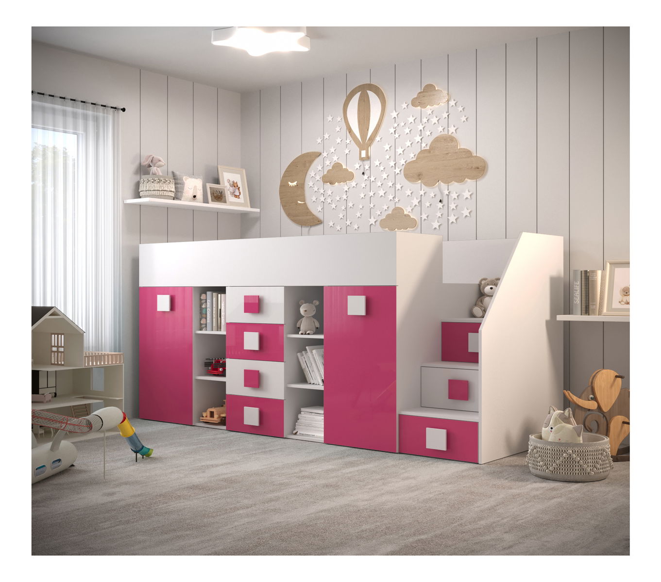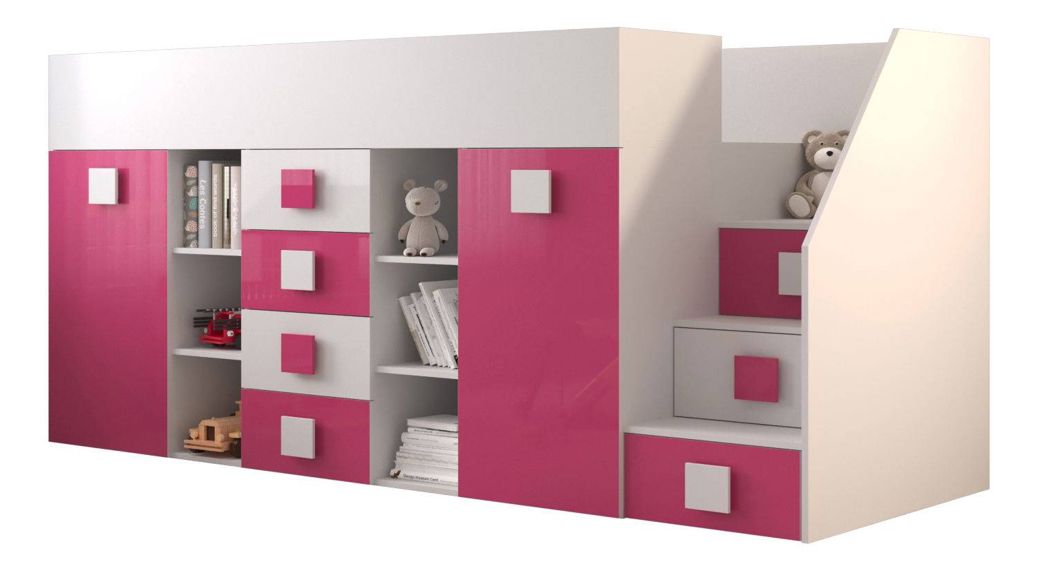 Dětská kombinovaná postel 90 cm Toreno 3 (bílá + bílý lesk + růžový lesk) (P)