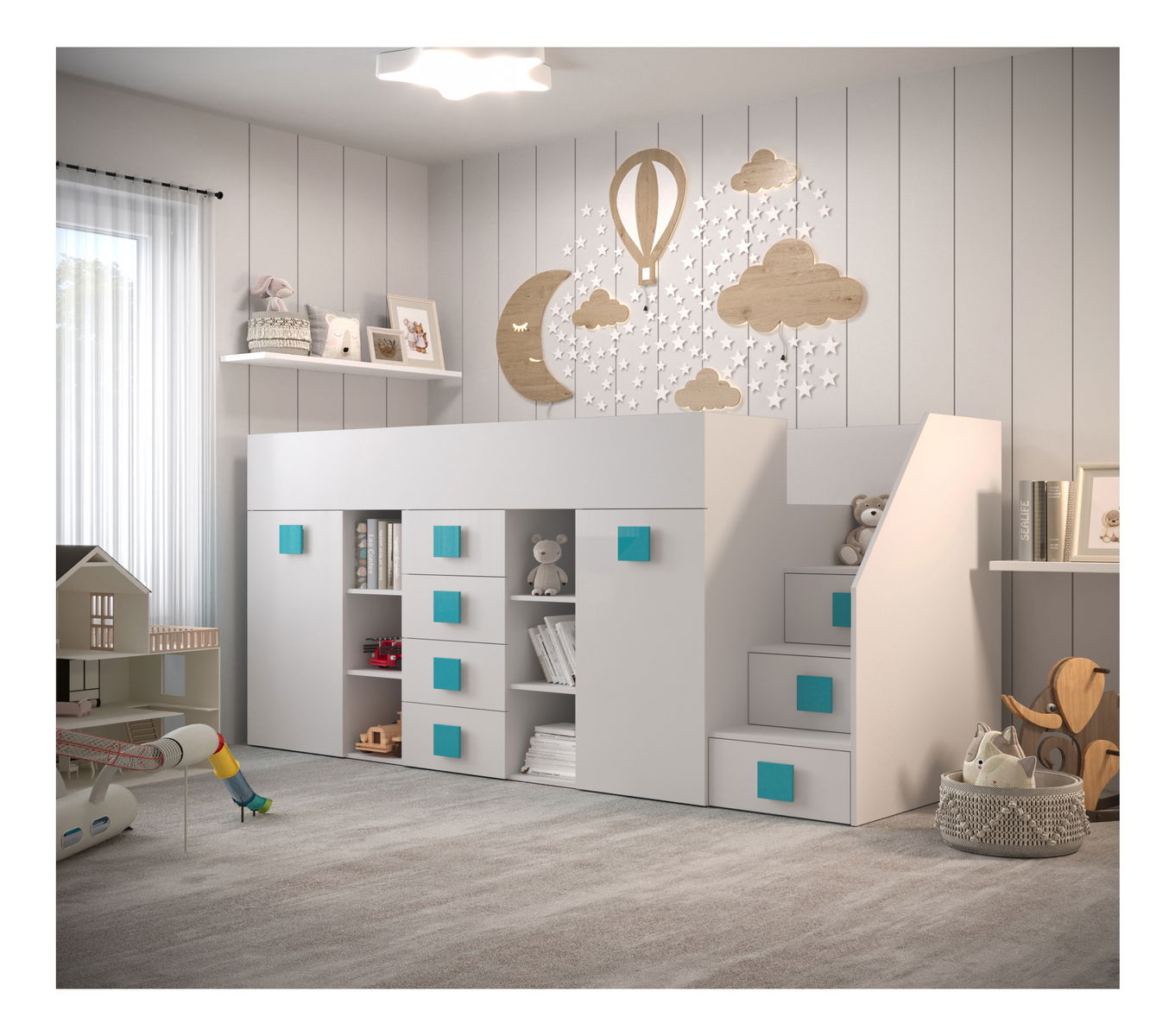 - Dětská kombinovaná postel 90 cm Toreno 3 (bílá + bílý lesk + tyrkysová lesklá madla) (P)