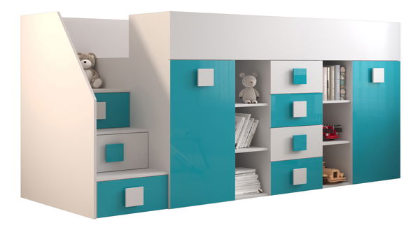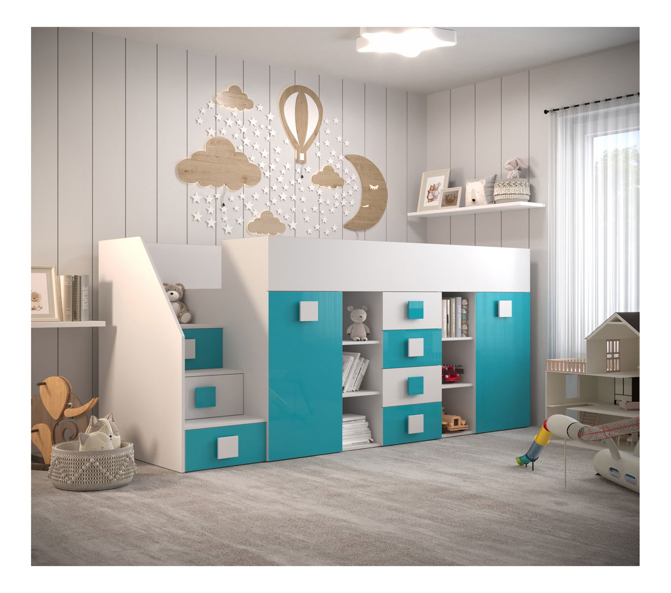 Dětská kombinovaná postel 90 cm Toreno 3 (bílá + bílý lesk + tyrkysový lesk) (L)
