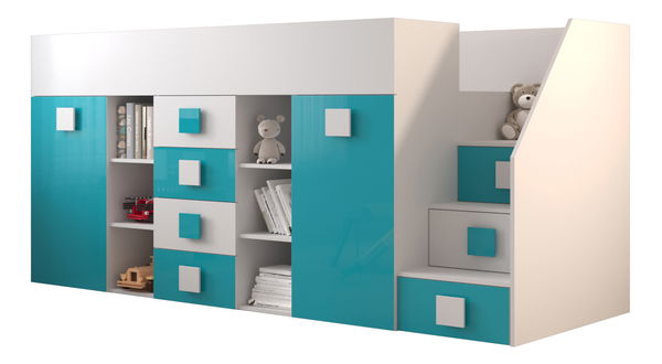 Dětská kombinovaná postel 90 cm Toreno 3 (bílá + bílý lesk + tyrkysový lesk) (P)