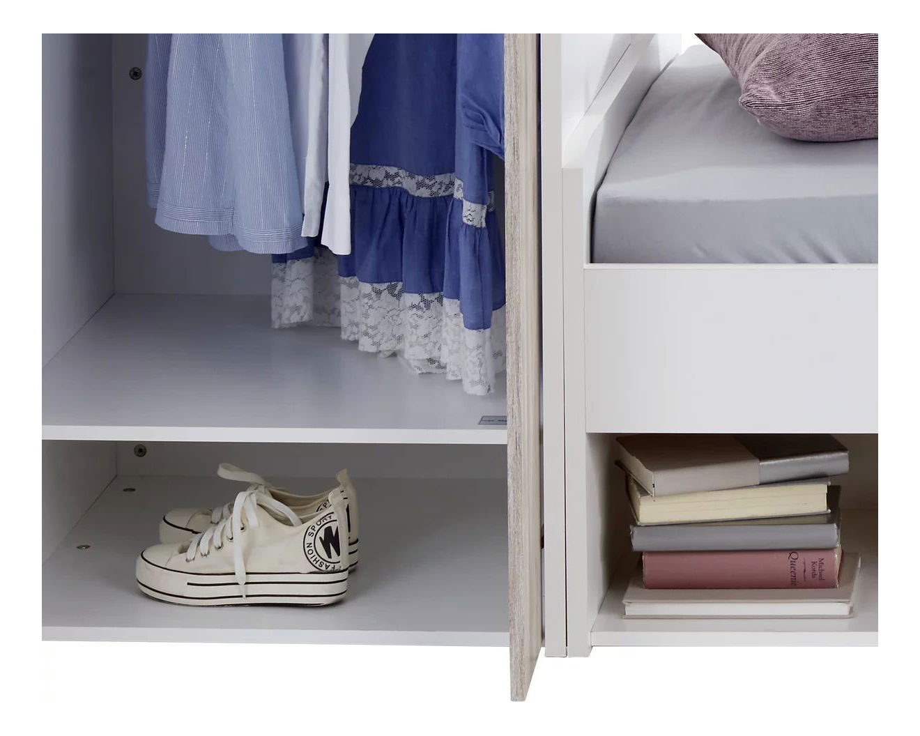 Úložný prostor: Zásuvky pod postelí, regál za spodní postelí a jedna věšáková skříň