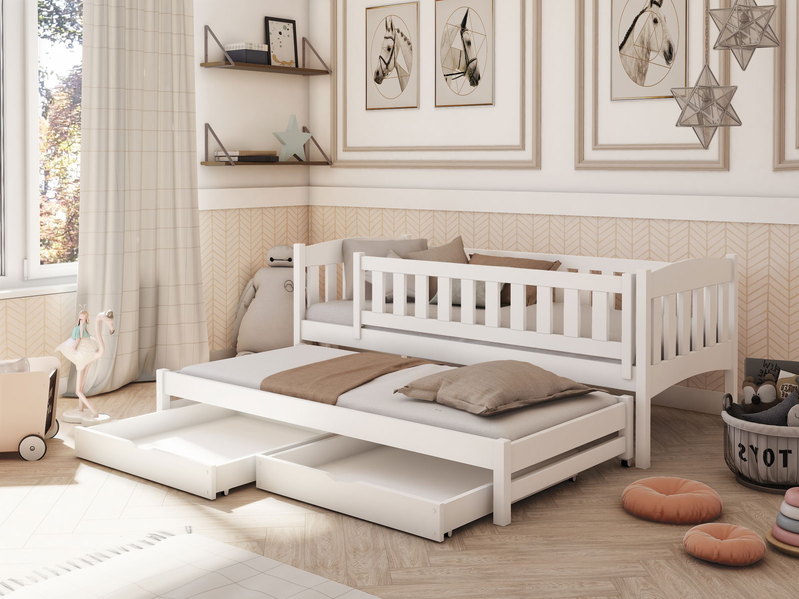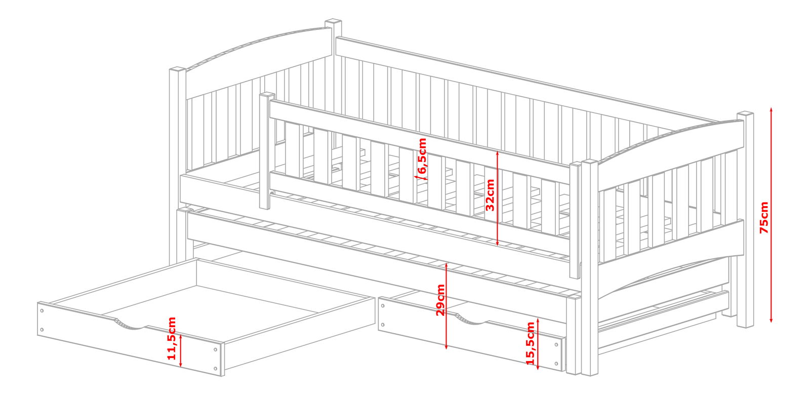 Rozkládací postel Amalia je vhodná pro zařízení pokoje pro dvě děti. Postel zabere stejný prostor jako jednolůžková postel, takže je vhodná i do malé místnosti. Po rozložení vytváří dvě pohodlné postele. Postel Amalia je celá vyrobena z borovicového dřeva. Horní část postele sestává z rámu a bariér obklopujících všechny strany. Spodní část je zasunuta pod rámem. Všechny barvy a laky použité při výrobě jsou certifikovány a neškodné pro uživatele. K dispozici je také praktický úložný prostor na ložní prádlo nebo hračky. Pryžová kolečka zásuvek nepoškrábou podlahu.
