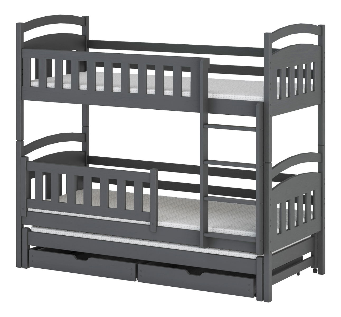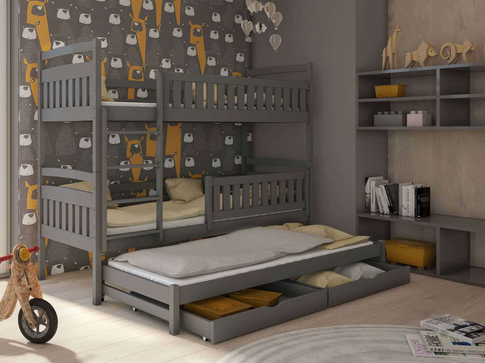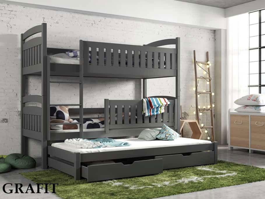 Patrová postel Blair je pohodlným modelem vhodným pro tři menší děti. Hodí se i do menšího dětského pokoje. Postel má tři lůžka. Třetí lůžko lze jednoduše vysunout. Výška od země po horní lůžko je 135 cm, výška od země po střední lůžko je 50 cm a výška po spodní lůžko je 35 cm. Výška nejspodnějšího lůžka je o 10 cm menší než lůžka nad ním. Horní a střední lůžka mají ochranné bariéry. Chrání děti před vypadnutím z postele. Postel Blair je vyrobena z borových desek, má stabilní a pevnou konstrukci. Postel disponuje také praktickým úložným prostorem v podobě dvou zásuvek na ložní prádlo a hračky.