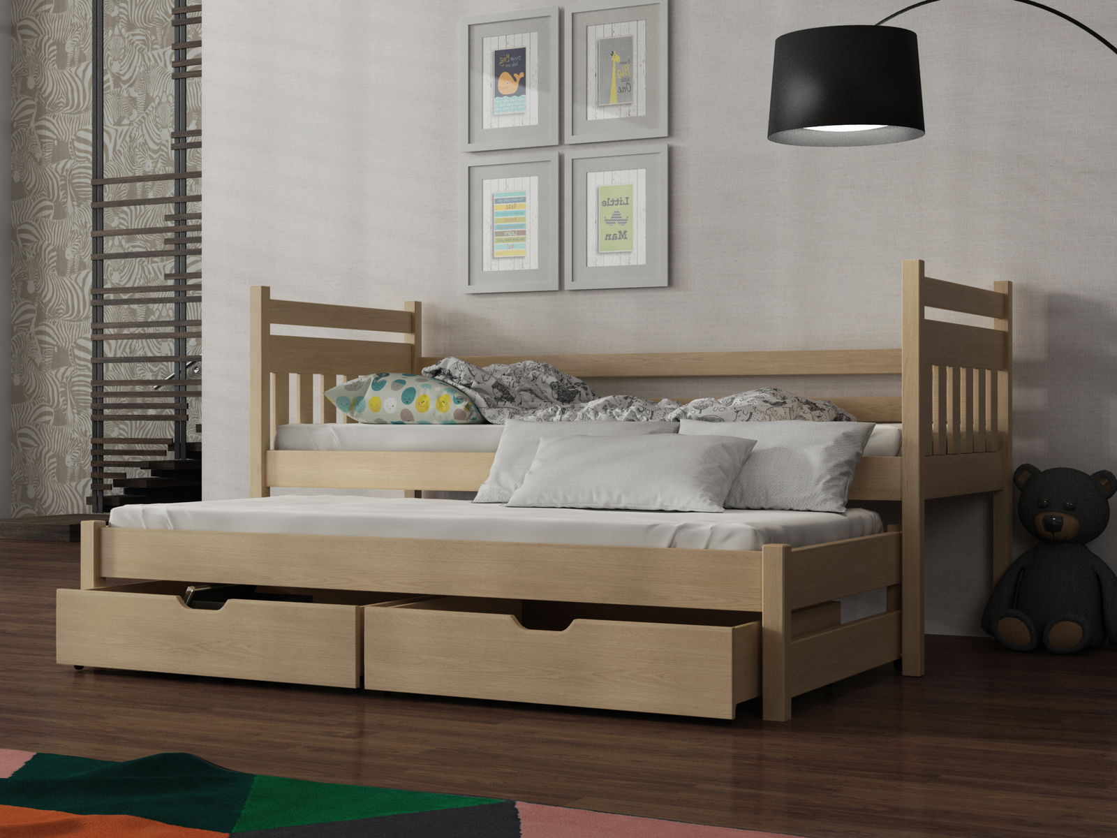 Rozkládací postel Danny je praktickým kouskem do dětského či studentského pokoje. Tento model se doporučuje zejména do menších interiérů. Postel byla ze tří stran zajištěna bariérou. Spodní lůžko je o 10 cm nižší než horní lůžko. Lze jej zasunout a jednoduše vysunout, čímž se šetří prostor v místnosti. Postel má také úložný prostor v podobě dvou zásuvek. Pryžová kolečka nepoškrábou podlahu.