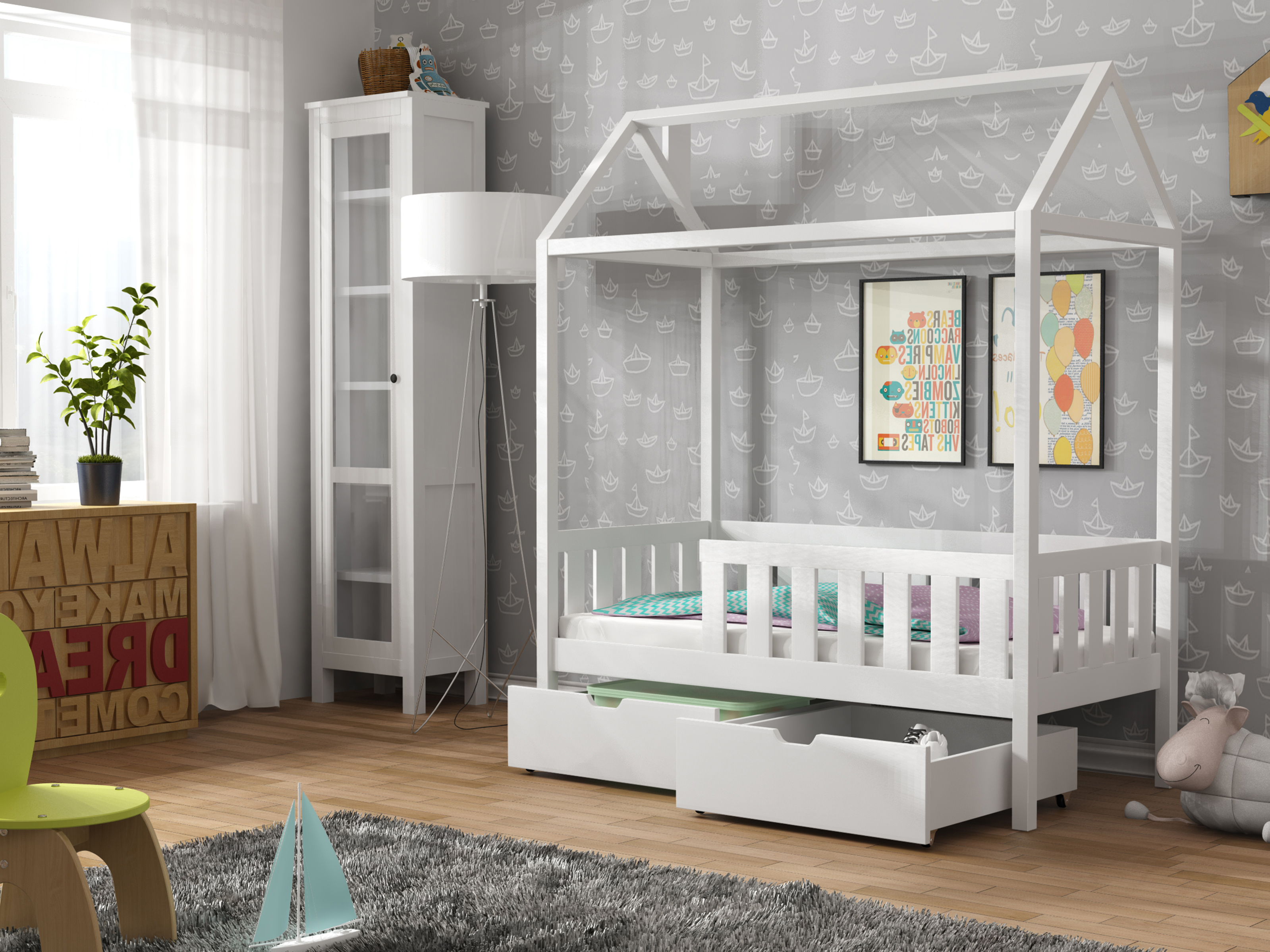 Dětská postel Donna je moderním a praktickým řešením do dětského pokoje. Je vyrobena výhradně z borovicového dřeva. Borovice nejenže neabsorbuje prach, ale je také mimořádně pevná a odolná. Postel má horní rám ve tvaru střechy. Může se na něj namontovat síť proti komárům nebo lze použít jako ozdoba. Bezpečnost dětí je zajištěna zábradlím připevněným na každé straně. Desky mají trojitý nátěr, čímž byla zajištěna přiměřená trvanlivost barvy. Použité materiály splňují všechny normy. Úložný prostor představují dvě zásuvky pod postelí. Představují samostatné prvky, v nichž lze uložit ložní prádlo, přikrývky nebo oblíbené hračky. Zásuvky jsou vyrobeny z dřevotřísky odolné proti poškození. Gumové kolečka nepoškrábou podlahu.