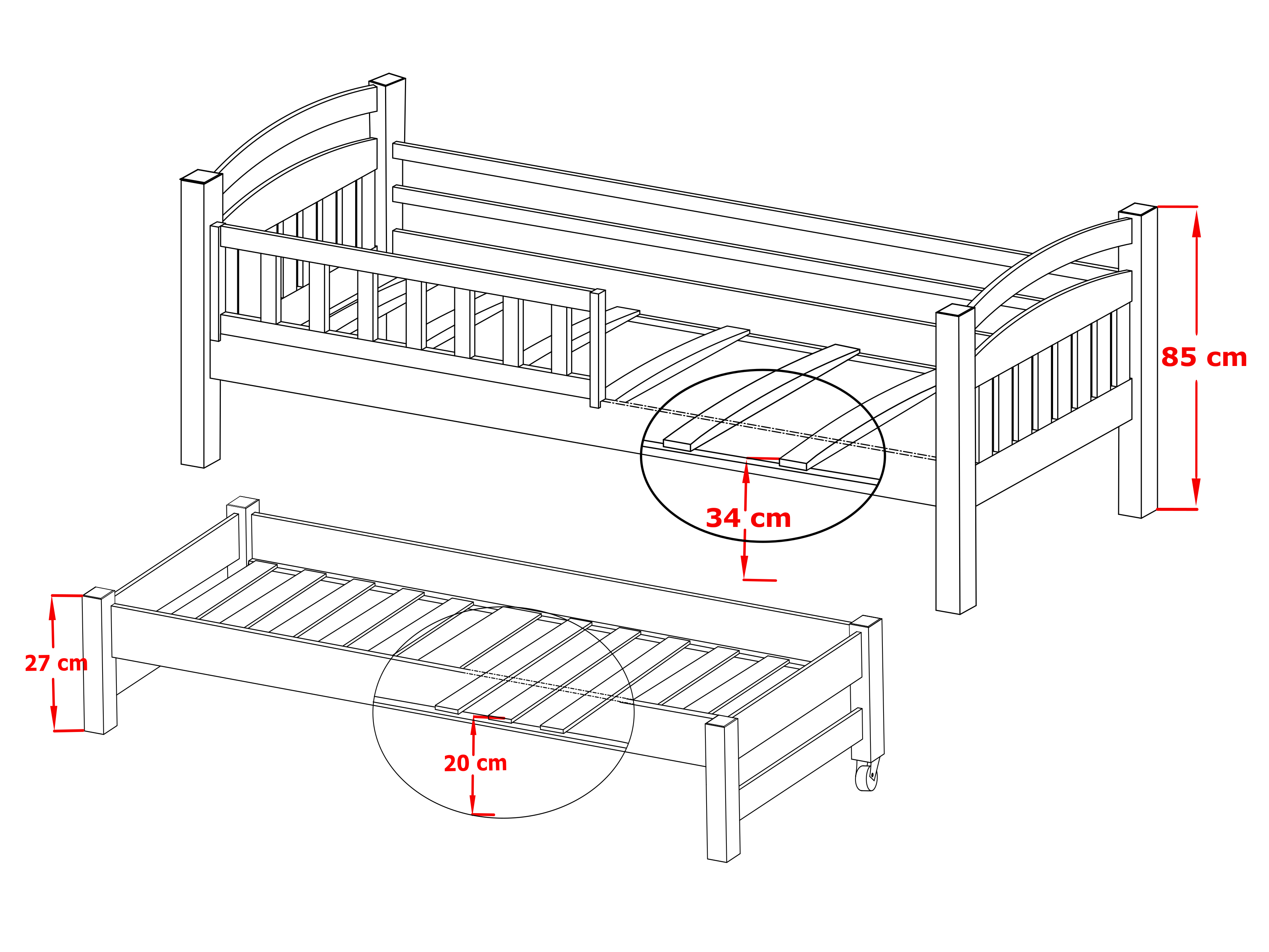 Nízká rozkládací postel Glynda pro 2 osoby je vhodnou postelí pro dvě děti. Doporučuje se zejména pro děti, které jsou příliš malé na patrovou postel. Postel má dvě lůžka na spaní - horní a spodní vysouvací. Horní lůžko se doporučuje zejména pro menší děti, které stále potřebují ochranu ve formě bariér. Obklopují postel ze všech stran a mají i užší průchod pro dítě, které se chce dostat do postele. Bariéru ze svislých příček lze kdykoliv odmontovat. Spodní lůžko je umístěno pod postelí a pohodlně ho vysunete ven. Postel tak zabírá přesně tolik místa jako jednolůžkový postel. Postel Glynda je vyrobena z borovicového dřeva, ošetřená lakem, který má všechny požadované certifikáty. Pro barvení se použila metoda rozprašování. Postel disponuje i úložným prostorem ve formě zásuvek na kolečkách. Gumové kolečka nepoškrábou podlahu.