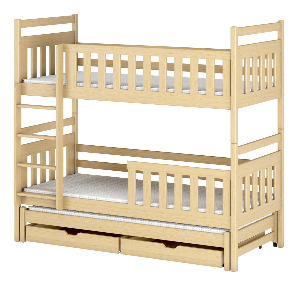 Zařiďte dětský pokoj s palandou Kristy. Hodí se i do menších dětských pokojů a pohodlně se na ní vyspí tři děti. Výška horního lůžka od země je 135 cm, výška středního lůžka od země je 50 cm. Dole se ještě nachází výsuvné lůžko, jehož plocha je v o 10 cm kratší než plocha ostatních lůžek. Toto lůžko funguje také jako samostatná postel. Horní a spodní lůžko má bariéry, které chrání děti před vypadnutím z postele. Patrová postel Kristy je vyrobena z borovicového dřeva. Ve výrobním procesu byly použity pouze bezpečné, certifikované barvy a laky. Postel disponuje také praktickým úložným prostorem v podobě dvou zásuvek.