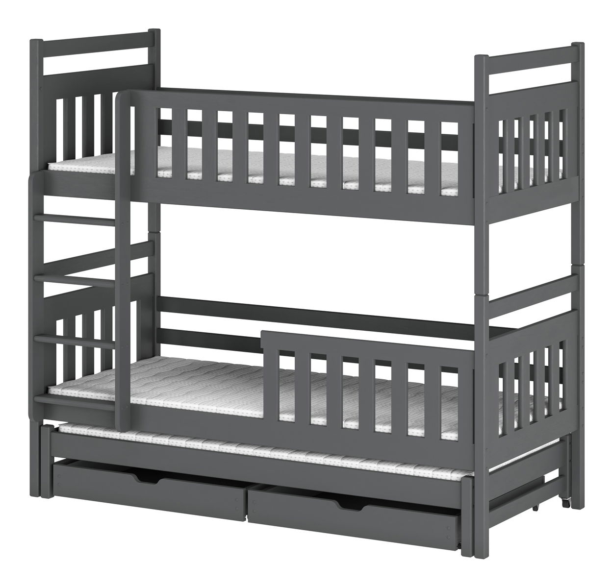 Zařiďte dětský pokoj s palandou Kristy. Hodí se i do menších dětských pokojů a pohodlně se na ní vyspí tři děti. Výška horního lůžka od země je 135 cm, výška středního lůžka od země je 50 cm. Dole se ještě nachází výsuvné lůžko, jehož plocha je o 10 cm menší než plocha ostatních lůžek. Toto lůžko funguje také jako samostatná postel. Horní a střední lůžko má bariéry, které chrání děti před vypadnutím z postele. Patrová postel Kristy je vyrobena z borovicového dřeva. Ve výrobním procesu byly použity pouze bezpečné, certifikované barvy a laky. Postel disponuje také praktickým úložným prostorem v podobě dvou zásuvek.