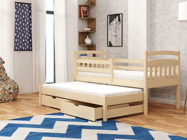 Rozkládací postel Maddie je model vhodný pro dvě děti, například sourozence. Doporučuje se zejména pro menší děti. Nábytek sestává ze dvou lůžek, umístěných pod sebou. Postel zabírá tolik místa jako jednolůžková postel. Hodí se do menšího pokoje, kde je potřeba šetřit prostor. Horní lůžko je vysoké 50 cm od země, spodní je vysoké 32 cm. Postel je vyrobena z borovicových desek, pečlivě chráněných barvami a laky. Jednotlivé prvky jsou třikrát stříkané. Pro výrobu byly použity pouze bezpečné materiály se všemi požadovanými certifikáty. Postel má i úložný prostor v podobě zásuvek. Gumové kolečka nepoškrábou podlahu.