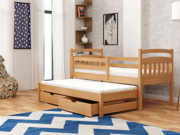 Rozkládací postel Maddie je model vhodný pro dvě děti, například sourozence. Doporučuje se zejména pro menší děti. Nábytek sestává ze dvou lůžek, umístěných pod sebou. Postel zabírá tolik místa jako jednolůžková postel. Hodí se do menšího pokoje, kde je potřeba šetřit prostor. Horní lůžko je vysoké 50 cm od země, spodní je vysoké 32 cm. Postel je vyrobena z borovicových desek, pečlivě chráněných barvami a laky. Jednotlivé prvky jsou třikrát stříkané. Pro výrobu byly použity pouze bezpečné materiály se všemi požadovanými certifikáty. Postel má i úložný prostor v podobě zásuvek. Gumové kolečka nepoškrábou podlahu.