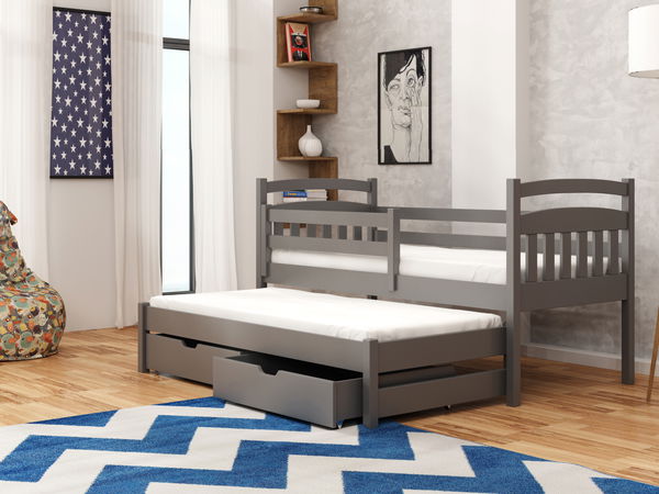 Rozkládací postel Maddie je model vhodný pro dvě děti, například sourozence. Doporučuje se zejména pro menší děti. Nábytek sestává ze dvou lůžek, umístěných pod sebou. Postel zabírá tolik místa jako jednolůžková postel. Hodí se do menšího pokoje, kde je potřeba šetřit prostor. Horní lůžko je vysoké 50 cm od země, spodní je vysoké 32 cm. Postel je vyrobena z borovicových desek, pečlivě chráněných barvami a laky. Jednotlivé prvky jsou třikrát stříkané. Pro výrobu byly použity pouze bezpečné materiály se všemi požadovanými certifikáty. Postel má i úložný prostor v podobě zásuvek. Gumové kolečka nepoškrábou podlahu.