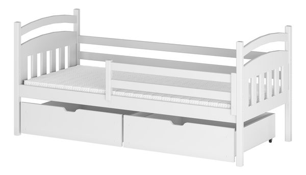 Elegantní, minimalistická jednolůžková postel je vhodným modelem do dětského pokoje. Postel je vyrobena výlučně z borového dřeva. Skládá se z pohodlného rámu a bariér obklopujících každou stranu. Díky nim dítě nevypadne z postele během spánku. Na jedné straně je bariéra kratší. Při instalaci bariéry si umíte zvolit stranu, kam ji umístíte. Všechny laky a barvy používané k ochraně a barvení mají požadované certifikáty a jsou zdravotně bezpečné. Postel disponuje úložným prostorem v podobě zásuvek.