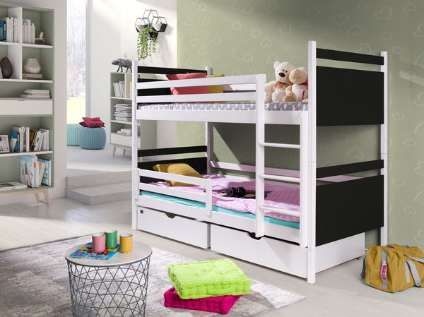 Stylová patrová postel Talia je skvělým doplňkem dětského pokoje. Zároveň šetří prostor, takže i v malých pokojích najde své využití. Vysoké patrové postele se doporučují pro trochu starší děti, které nemají problém vylézt po žebříku. Horní a dolní lůžko je zajištěno bariérami, které brání vypadnutí během spánku. Postel je vyrobena z dřevěných desek, které mají opracované hrany tak, aby nepředstavovaly nebezpečí pro děti. Používané barvy a laky jsou ekologicky bezpečné a splňují potřebné normy. Postel má i úložný prostor na kolečkách. Gumové kolečka nepoškrábou podlahu.
