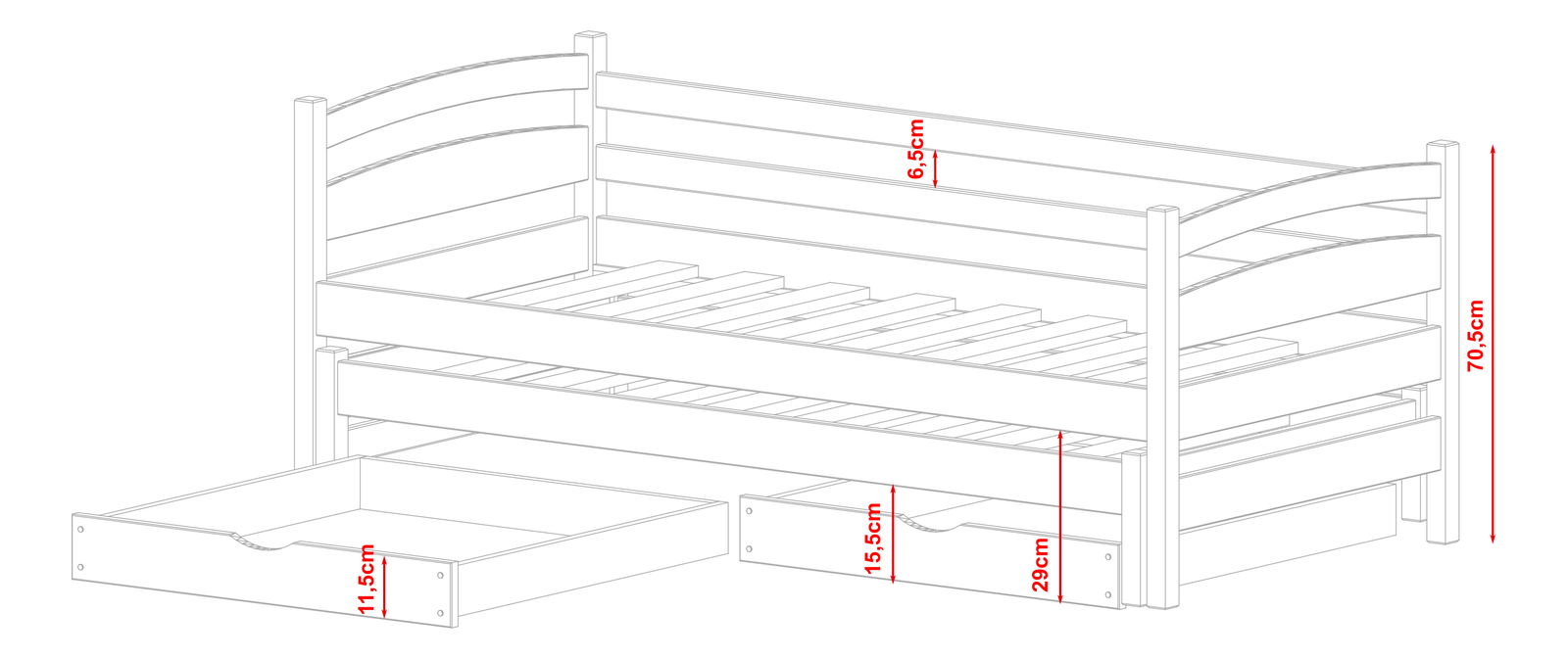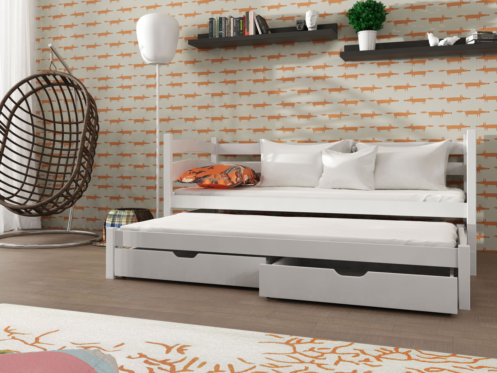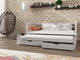 Rozkládací postel Tiana je pohodlný kus nábytku pro dvě osoby. Je to skvělá alternativa k vysoké patrové posteli. Postel sestává z rámu s bariérou a spodního výsuvného lůžka, které lze kdykoli vysunout. To šetří prostor v místnosti, který lze použít ke hraní nebo učení. Spodní lůžko je o 10 cm nižší než horní lůžko. Postel je vyrobena z borového dřeva. Všechny barvy používané při malování mají požadované certifikáty a jsou naprosto bezpečné. Postel má také úložný prostor v podobě zásuvek na ložní prádlo. Pryžová kolečka nepoškrábou podlahu.