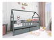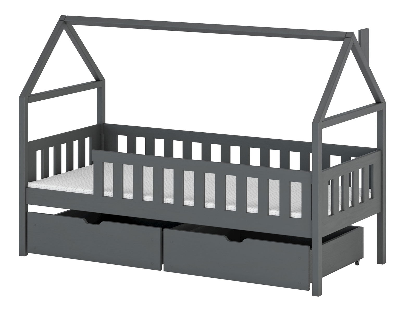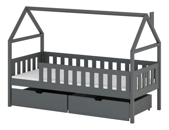 Dětská postel Donna je moderním a praktickým řešením do dětského pokoje. Je vyrobena výlučně z borového dřeva. Borovice nejenže neabsorbuje prach, ale je také mimořádně pevná a odolná. Postel má horní rám ve tvaru střechy. Může se na něj namontovat síť proti komárům nebo se může použít jako ozdoba. Bezpečnost dětí je zajištěna zábradlím připevněným na každé straně. Desky mají trojitý nátěr, čímž byla zajištěna přiměřená trvanlivost barvy. Použité materiály splňují všechny normy. Úložný prostor představují dvě zásuvky pod postelí. Představují samostatné prvky, ve kterých lze uložit ložní prádlo, přikrývky nebo oblíbené hračky. Zásuvky jsou vyrobeny z dřevotřísky odolné proti poškození. Pryžová kolečka nepoškrábou podlahu.