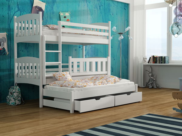 Patrová postel Anja je vysoká postel pro 3 menší děti, která je vhodná i do menších pokojíčků, kde je třeba šetřit prostorem. Postel má dodatečnou ochranu ve formě bariér. Na horním lůžku jsou bariéry pevně připevněny, ze spodního lůžka se dají bariéry odmontovat. Výška mezi jednotlivými lůžky je 75 cm. Třetí lůžko se nachází pod spodním lůžkem a dá se jednoduše vysunout. K dispozici je i úložný prostor v podobě dvou zásuvek.