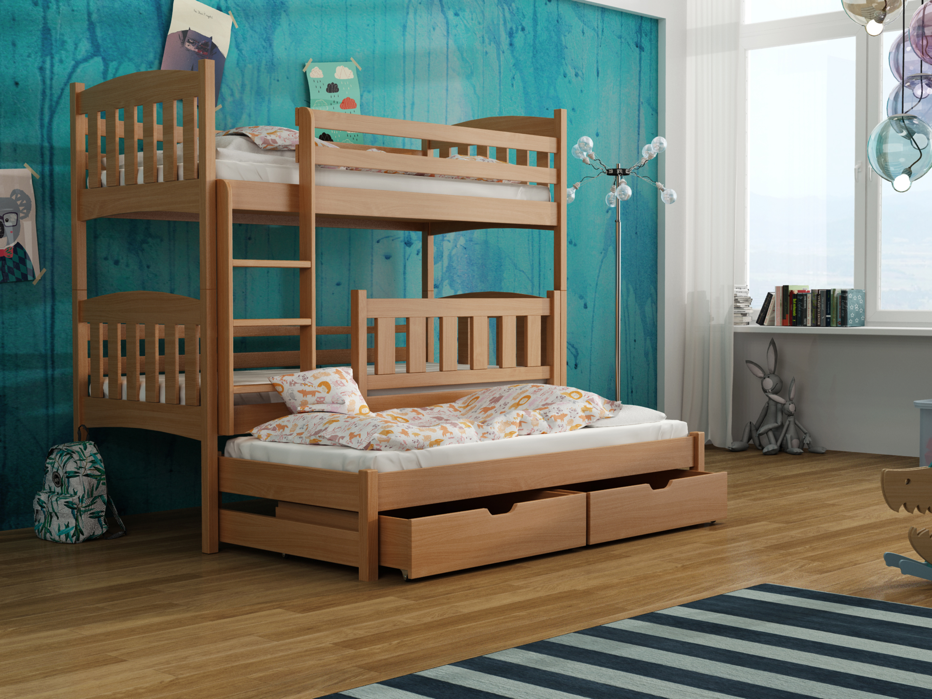 Patrová postel Anja je vysoká postel pro 3 menší děti, která je vhodná i do menších pokojíčků, kde je třeba šetřit prostorem. Postel má dodatečnou ochranu ve formě bariér. Na horním lůžku jsou bariéry pevně připevněny, ze spodního lůžka se dají bariéry odmontovat. Výška mezi jednotlivými lůžky je 75 cm. Třetí lůžko se nachází pod spodním lůžkem a dá se jednoduše vysunout. K dispozici je i úložný prostor v podobě dvou zásuvek.