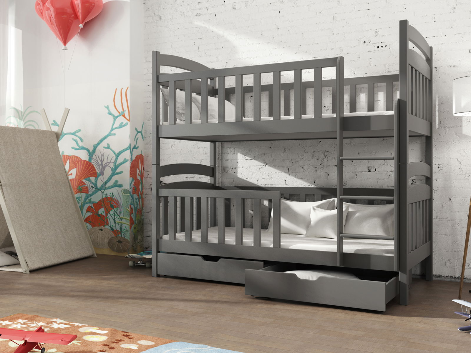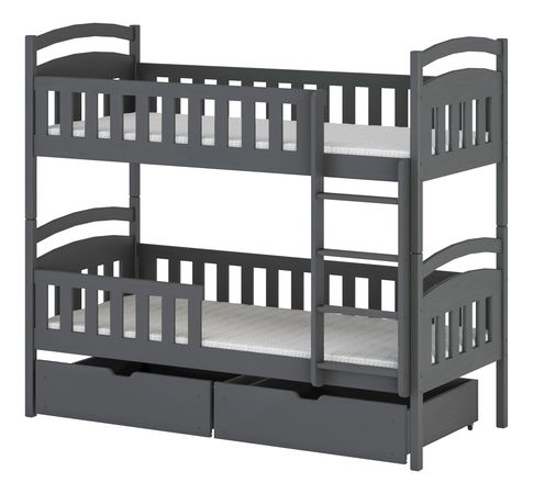 Patrová postel Antone je vysoká postel vhodná pro dvě děti. Postel je určena speciálně pro děti, které mají nejméně 6 let a nemají problém s lezením po žebříku. Patrové postele jsou ideální pro dětské pokoje, kde spolu žijí sourozenci. Postel zároveň šetří prostor v pokoji. Ochrana dětí před pádem z postele je zajištěna dřevěnými bariérami, které se nacházejí na spodním i horním lůžku. Bariéry jsou vysoké 26 cm. Vzdálenost mezi lůžky je 70 cm. Postel je barvená a lakovaná barvami a laky s požadovanými normami. Součástí postele je také úložný prostor v podobě šuplíků na kolečkách. Pryžová kolečka nepoškrábou podlahu.