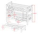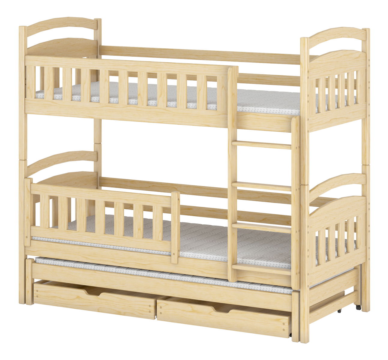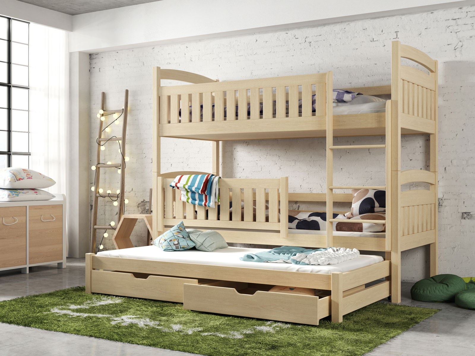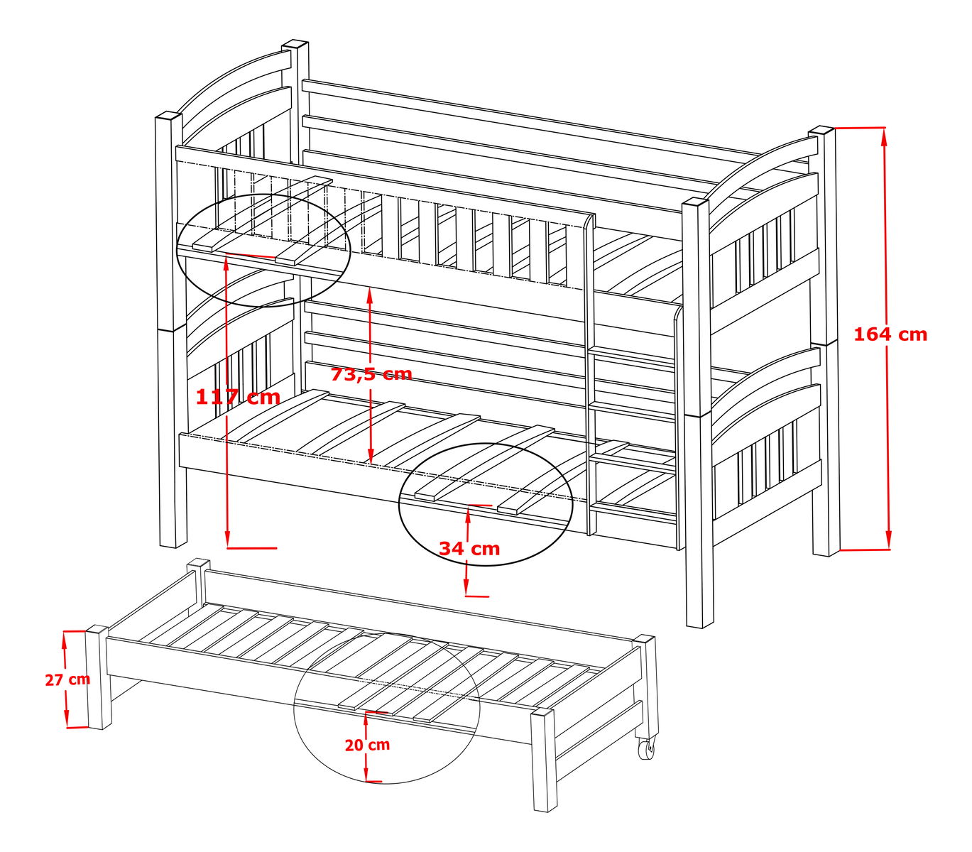 ZobrazitPatrová postel Blair je pohodlným modelem vhodným pro tři menší děti. Hodí se i do menšího dětského pokoje. Postel má tři lůžka. Třetí lůžko lze jednoduše vysunout. Výška od země po horní lůžko je 135 cm, výška od země po střední lůžko je 50 cm a výška po spodní lůžko je 35 cm. Výška nejspodnějšího lůžka je o 10 cm menší než lůžka nad ním. Horní a střední lůžka mají ochranné bariéry. Chrání děti před vypadnutím z postele. Postel Blair je vyrobena z borových desek, má stabilní a pevnou konstrukci. Postel disponuje také praktickým úložným prostorem v podobě dvou zásuvek na ložní prádlo a hračky.