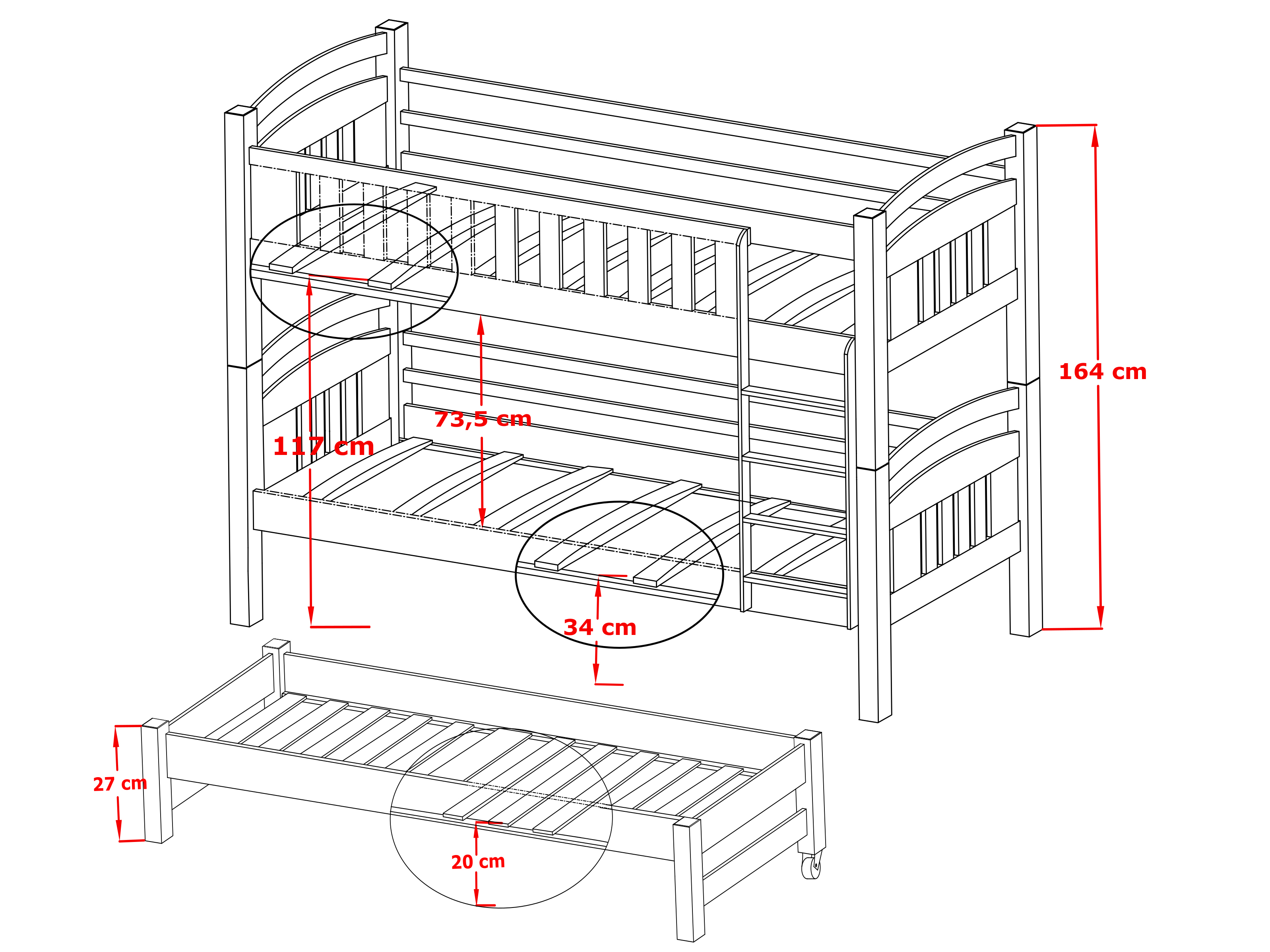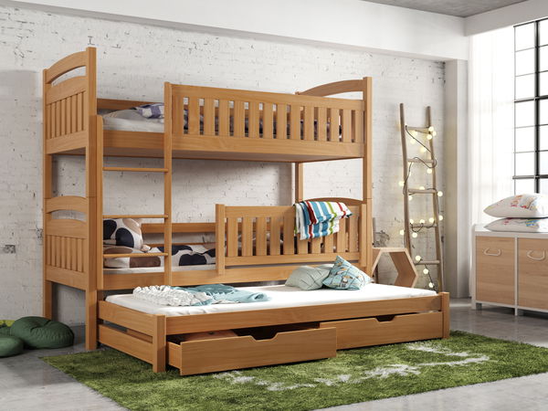 Patrová postel Blair je pohodlným modelem vhodným pro tři menší děti. Hodí se i do menší dětského pokoje. Postel má tři lůžka. Třetí lůžko lze jednoduše vysunout. Výška od země po horní lůžko je 135 cm, výška od země po střední lůžko je 50 cm a výška po spodní lůžko je 35 cm. Výška nejspodnějšího lůžka je o 10 cm menší než lůžka nad ním. Horní a střední lůžka mají ochranné bariéry. Chrání děti před vypadnutím z postele. Postel Blair je vyrobena z borovicových desek, má stabilní a pevnou konstrukci. Postel disponuje i praktickým úložným prostorem v podobě dvou zásuvek na ložní prádlo a hračky.