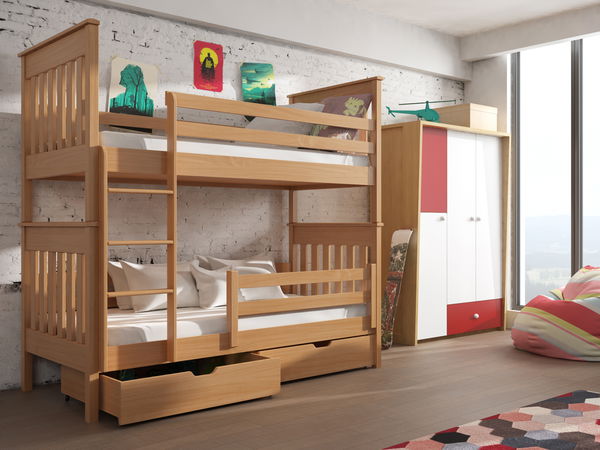 Patrová postel Brad je stylová postel do dětského pokoje. Je ideální v případech, kdy chceme vytvořit místo na spaní pro 2 děti v jedné místnosti. Postel je vhodná spíše pro starší děti, které již nemají problém lézt po žebříku. Vzdálenost mezi lůžky je 78 cm. Výška od země po horní lůžko je 124 cm, výška od země po spodní lůžko je 78 cm. Lůžka mají ochranné bariéry, které zabraňují vypadnutí během spánku. Na horní lůžko vede žebřík, který lze namontovat na levou nebo pravou stranu. Postel se vyznačuje pevnou konstrukcí a pečlivým propracováním detailů. Postel má i úložný prostor v podobě dvou zásuvek. Gumové kolečka zásuvek nepoškrábou podlahu.