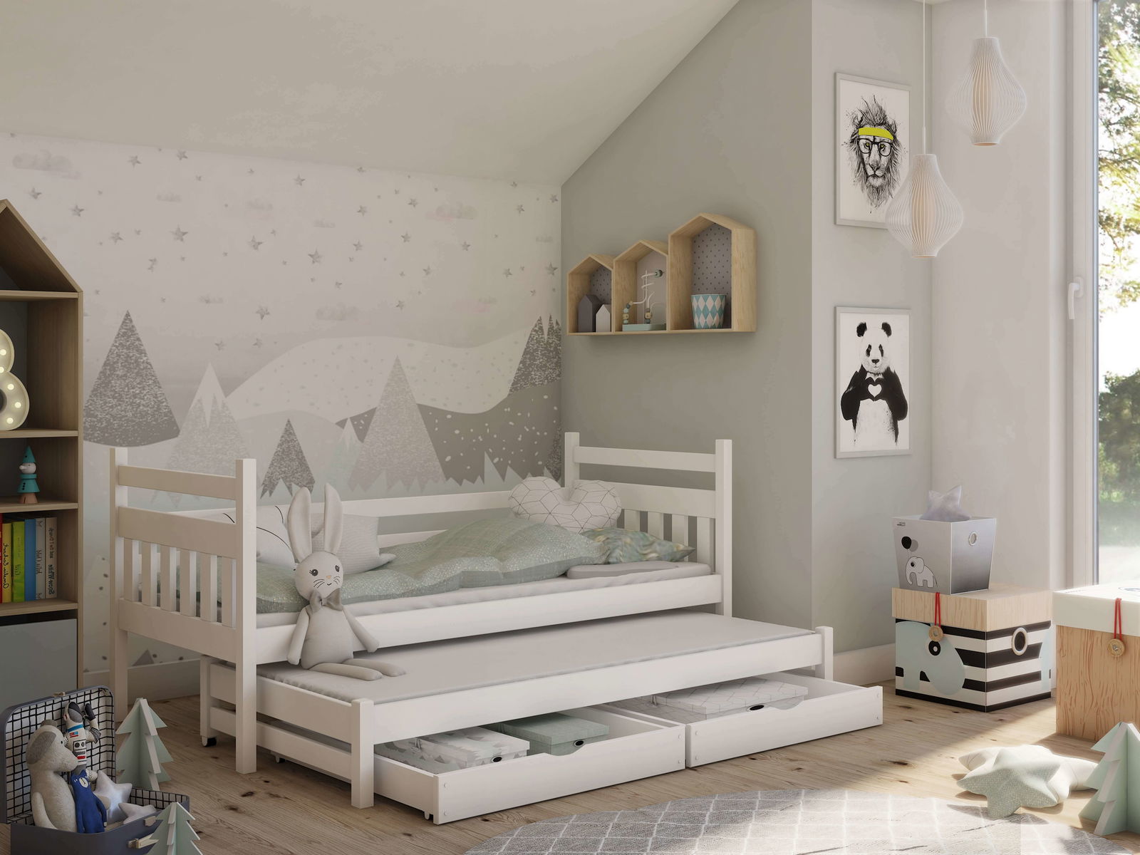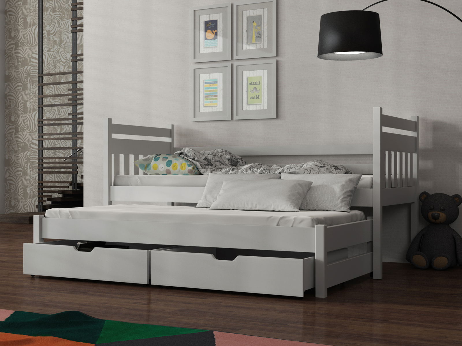 Rozkládací postel Danny je praktickým kouskem do dětského či studentského pokoje. Tento model se doporučuje zejména do menších interiérů. Postel byla ze tří stran zajištěna bariérou. Spodní lůžko je o 10 cm nižší než horní lůžko. Lze jej zasunout a jednoduše vysunout, čímž se šetří prostor v místnosti. Postel má také úložný prostor v podobě dvou zásuvek. Pryžová kolečka nepoškrábou podlahu.