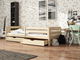 Dřevěná dětská postel Erin je elegantní a stabilní postel do dětského pokoje. Skládá se z dřevěného rámu a bariér obklopujících celek. Je dobrou volbou zejména pro menší dítě. Bariéry lze kdykoli odstranit. Postel je vyrobena z dřevěných prken lakovaných ekologickými barvami. Ve spodní části jsou dvě prostorné zásuvky, do kterých můžete uložit ložní prádlo nebo hračky. Představují samostatné prvky, které nejsou spojeny s postelí. Vysouvají se pomocí gumových koleček, která nepoškrábou podlahu.