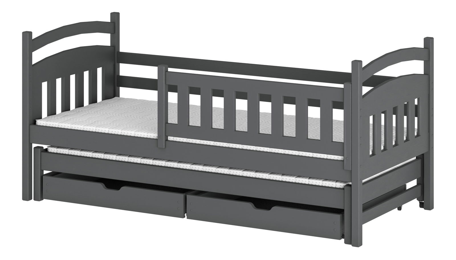 Nízká rozkládací postel Glynda pro 2 osoby je vhodnou postelí pro dvě děti. Doporučuje se zejména pro děti, které jsou příliš malé na palandu. Postel má dvě lůžka na spaní – vyšší a spodní vysouvací. Horní lůžko se doporučuje zejména pro menší děti, které stále potřebují ochranu ve formě bariér. Obklopují postel ze všech stran a mají také užší průchod pro dítě, které se chce dostat do postele. Bariéru ze svislých příček lze kdykoli odmontovat. Spodní lůžko je umístěno pod postelí a pohodlně jej vysunete ven. Postel tak zabírá přesně tolik místa jako jednolůžková postel. Postel Glynda je vyrobena z borovicového dřeva, ošetřená lakem, který má všechny požadované certifikáty. K barvení byla použita metoda rozprašování. Postel disponuje také úložným prostorem ve formě zásuvek na kolečkách. Pryžová kolečka nepoškrábou podlahu.
