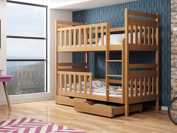 Patrová postel Mao je postel vhodná pro 2 děti, které zvládnou lezení po žebříku. Horní i dolní lůžko je zajištěno ochrannými bariérami, takže děti nevypadnou z postele během spánku. Vzdálenost mezi lůžky je 75 cm. Výška od země po horní lůžko je 120 cm, výška od země po spodní lůžko je 35 cm. Postel Mao je stabilní a pevná postel vyrobená výhradně z borovice. Barvy a laky použité ve výrobním procesu splňují všechny požadované normy. Součástí je i úložný prostor na kolečkách. Gumové kolečka nepoškrábou podlahu.