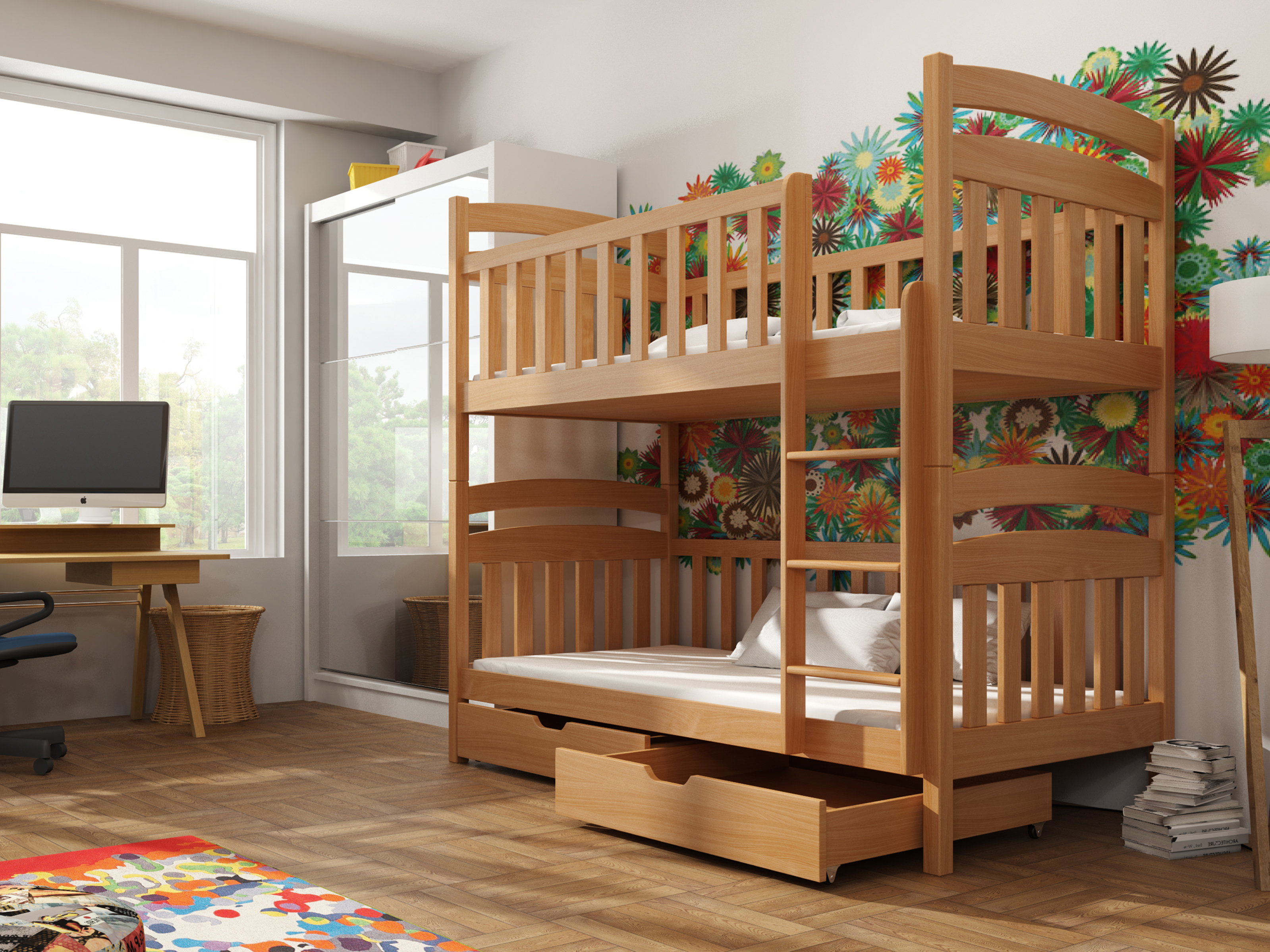 Patrová postel Marlo je vysoká postel vhodná pro 2 děti. Hodí se do menších místností, kde je třeba šetřit prostor. Patrová postel zabírá přesně tolik místa jako jednolůžkový postel. Postel je vhodná zejména pro děti, které nemají problém vylézt po žebříku. Žebřík se dá namontovat na pravou nebo levou stranu. Postel má ochranné bariéry, které zabraňují pádu dítěte během spánku. Vzdálenost mezi lůžky je 70 cm. Její výhodou je i šikovný úložný prostor v dolní části. Kolečka úložného prostoru nepoškrábou podlahu.