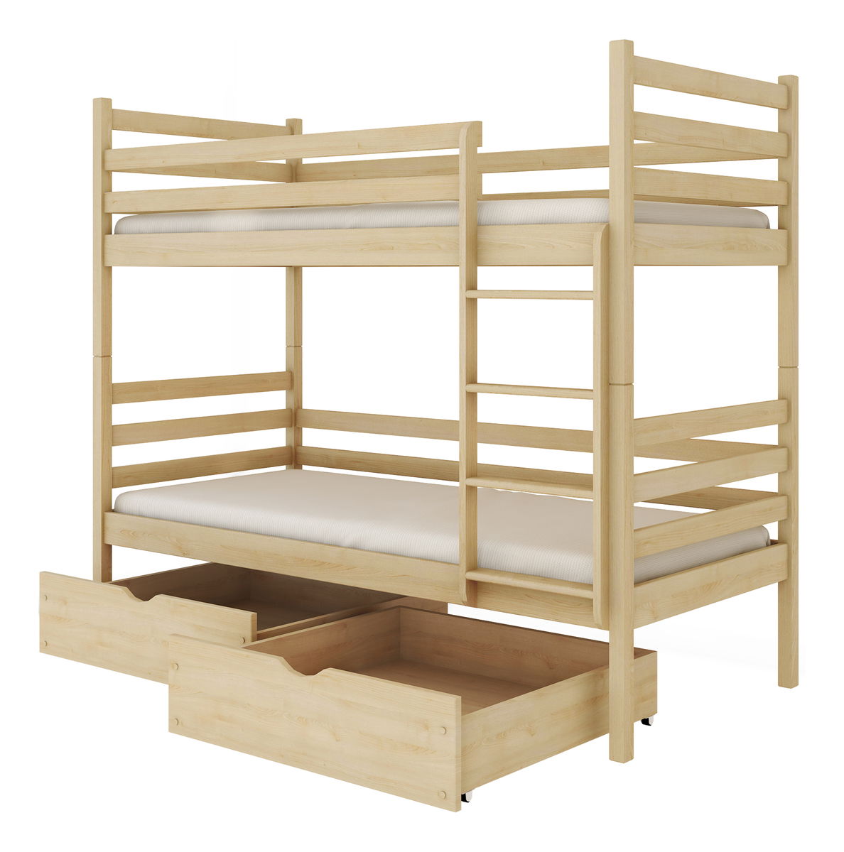Vysokou palandou Nubia jistě potěšíte Vaše děti. Hodí se i do menších místností, ve kterých je třeba šetřit prostor. Postel zabere tolik prostoru jako jednolůžková postel. Horní i spodní lůžko má ochranné bariéry, které chrání děti před vypadnutím z postele. Na horní lůžko vede žebřík, který lze namontovat na levou i na pravou stranu. Vzdálenost mezi lůžky je 70 cm. Postel má také praktický úložný prostor ve spodní části v podobě dvou zásuvek. Pryžová kolečka zásuvek nepoškrábou podlahu.