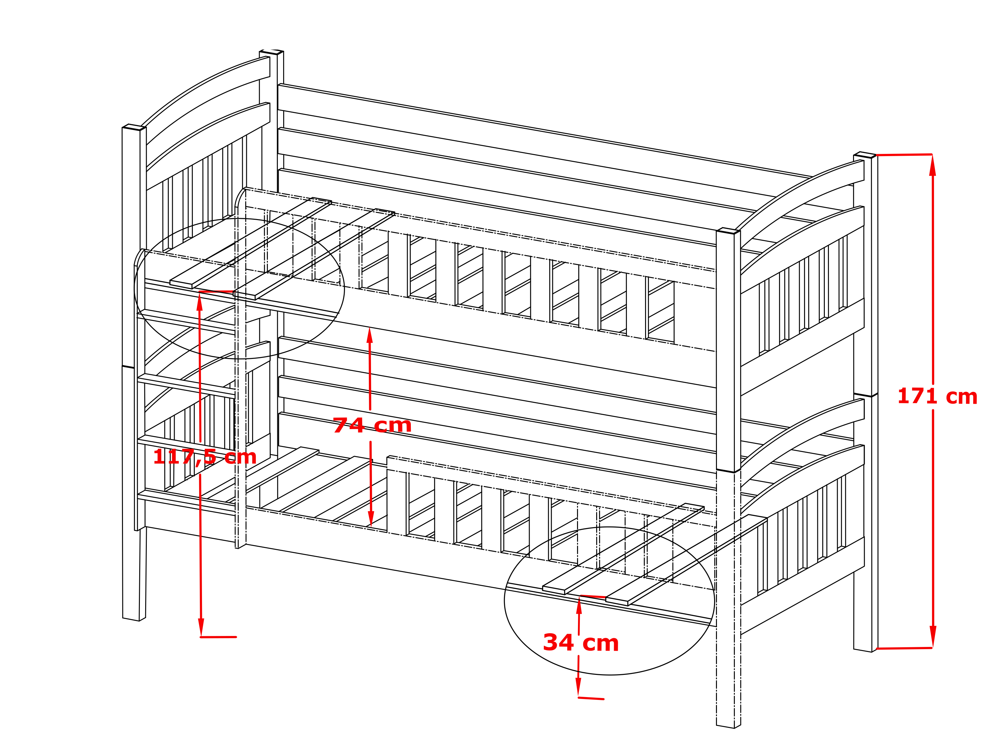 Patrová postel Sarina je klasická vysoká postel pro 2 děti. Je vyrobena výhradně z masivních borovicových desek se zaoblenými hranami. Horní a také spodní lůžko je zajištěno vysokými bariérami ve formě svislých příček. Na horním lůžku jsou o něco nižší než na dolním. Vzdálenost mezi lůžky je 75 cm. Výška od země po horní lůžko je 120 cm, výška od země po spodní lůžko je 35 cm. Na horní lůžko vede žebřík. Dá se namontovat na levou i pravou stranu. Postel má úložný prostor v podobě dvou zásuvek na kolečkách. Gumové kolečka zásuvek nepoškrábou podlahu.