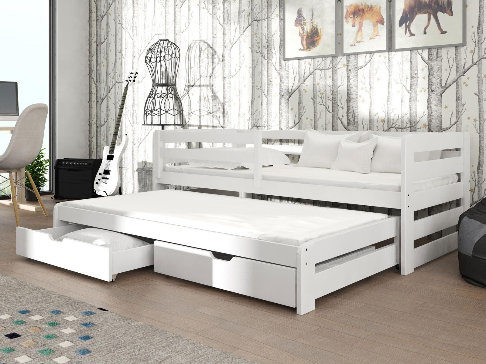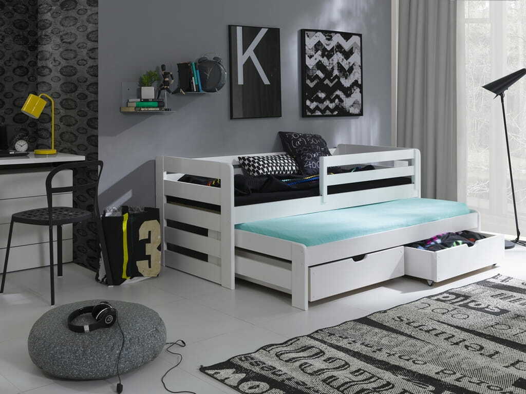 ZobrazitRozkládací postel je praktická do dětského pokoje, pokud Vašemu dítěti přijde kámo na návštěvu. Jednoduše vysunete spodní lůžko a další postel je na světě. Navíc má postel ještě dvě zásuvky, ve kterých může mít Vaše ratolest uložené hračky nebo ložní prádlo. Postel má také praktickou bariérku, která zabrání případnému pádu dítěte na zem.