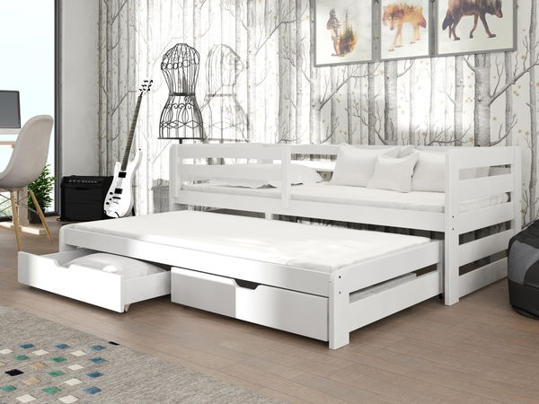 Rozkládací postel je praktická do dětského pokoje, pokud Vašemu dítěti přijde kamarád na návštěvu. Jednoduše vysunete spodní lůžko a další lůžko je na světě. Navíc má postel ještě dvě zásuvky, v nichž může mít Vaše ratolest uložené hračky nebo povlečení. Postel má i praktickou bariérku, která zabrání případnému pádu dítěte na zem.
