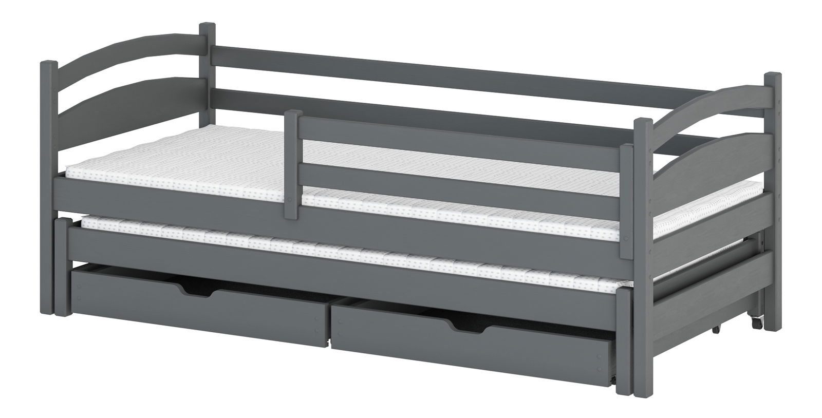 Rozkládací postel Tiana je pohodlný kus nábytku pro dvě osoby. Je to skvělá alternativa k vysoké patrové posteli. Postel sestává z rámu s bariérou a spodního výsuvného lůžka, které lze kdykoli vysunout. To šetří prostor v místnosti, který lze použít ke hraní nebo učení. Spodní lůžko je o 10 cm nižší než horní lůžko. Postel je vyrobena z borového dřeva. Všechny barvy používané při malování mají požadované certifikáty a jsou naprosto bezpečné. Postel má také úložný prostor v podobě zásuvek na ložní prádlo. Pryžová kolečka nepoškrábou podlahu.