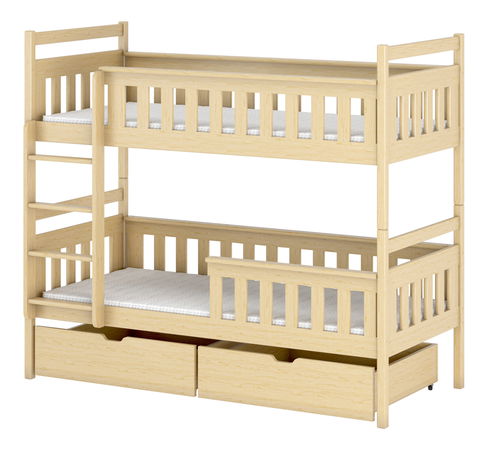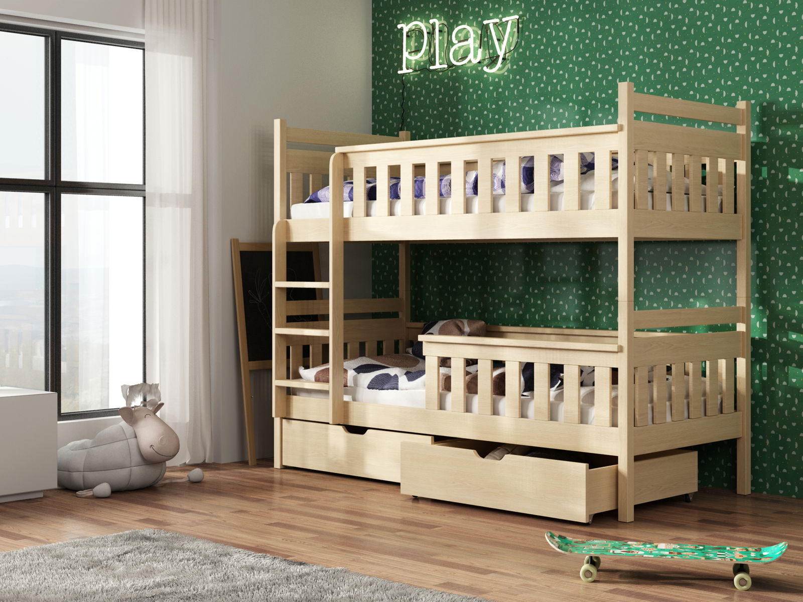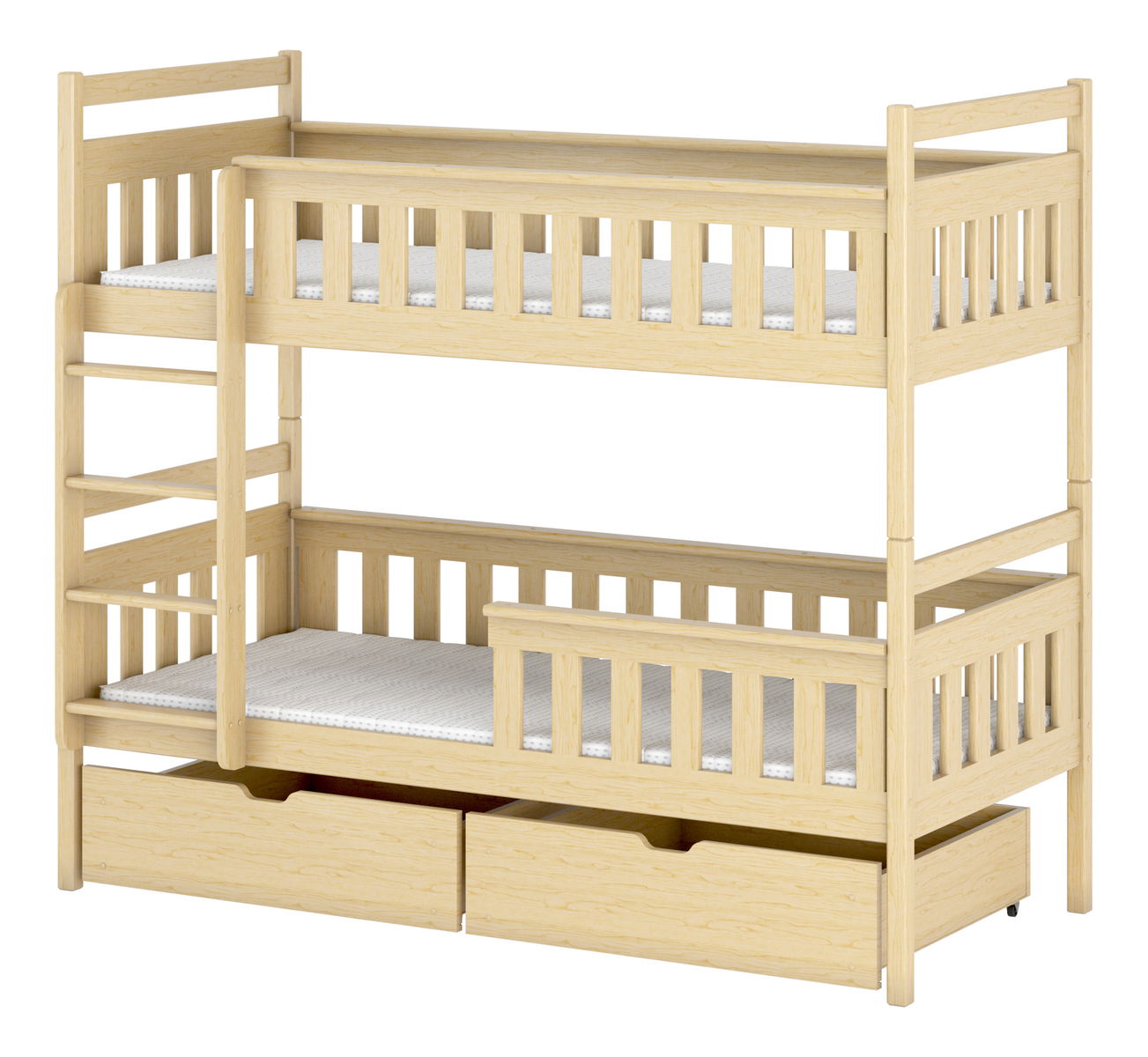 Patrová postel Tommy je stylová postel pro dvě děti. Je vhodná pro sourozence, kteří spolu sdílejí pokoj. V menších pokojích šetří prostor. Vzdálenost mezi lůžky je 68 cm. Výška od země po horní lůžko je 115 cm, výška od země po spodní lůžko je 35 cm. Postel má ochranné bariéry, které zabraňují vypadnutí během spánku. Postel je vyrobena z masivních borových desek. Stojí na čtvercových nožičkách, které jí dodávají stabilitu. Postel disponuje úložným prostorem. Pryžová kolečka zásuvek nepoškrábou podlahu.