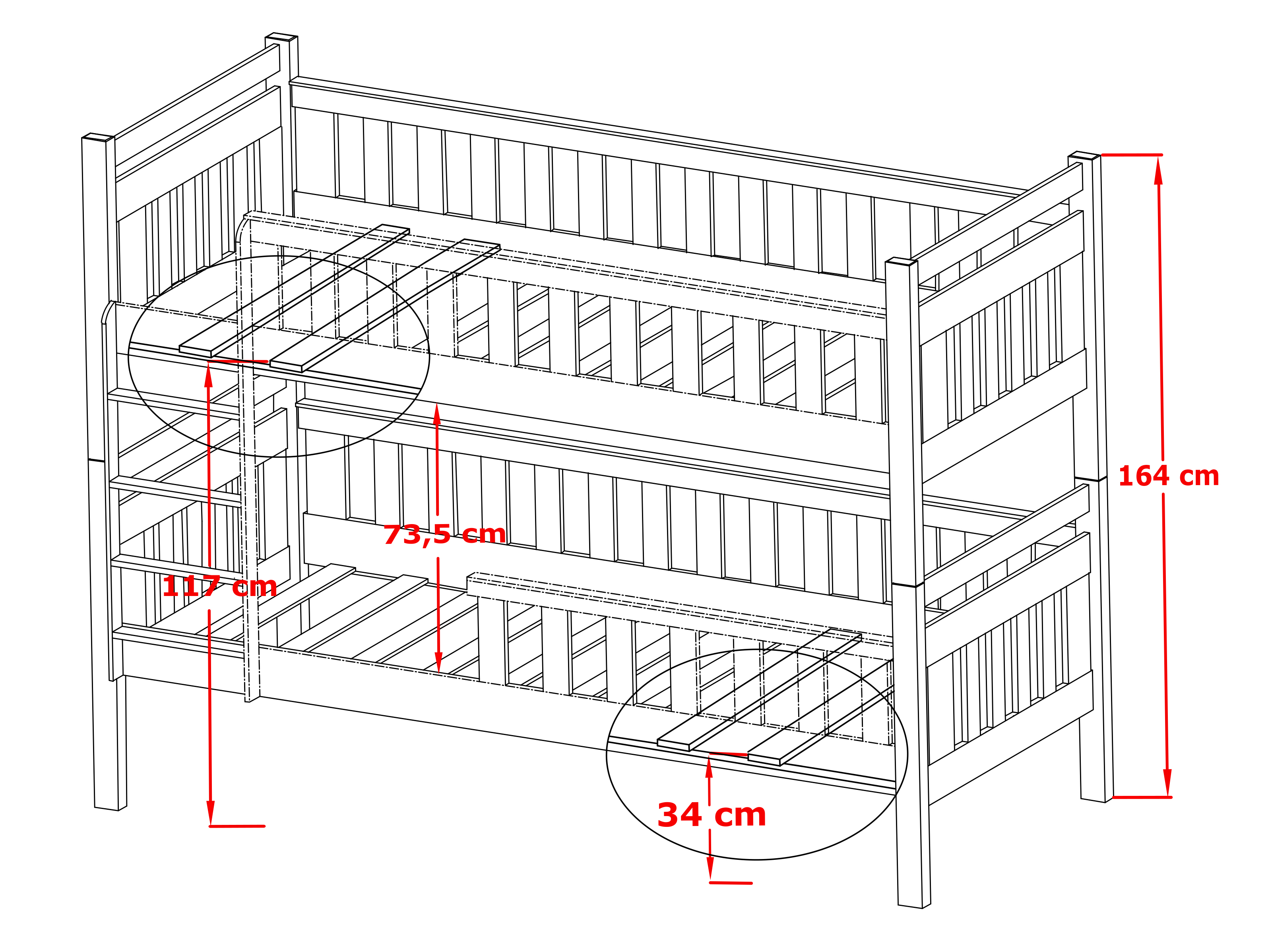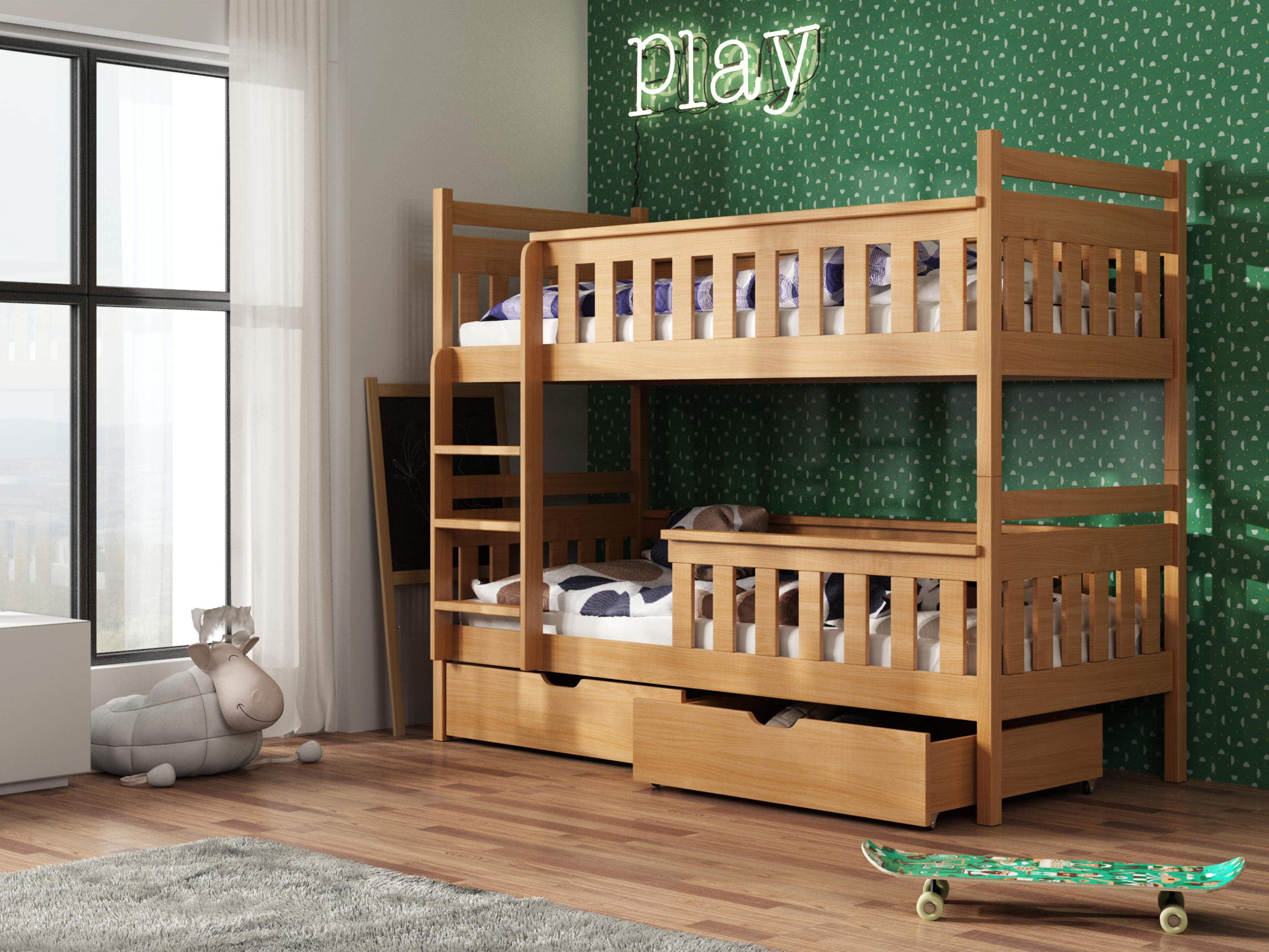 Patrová postel Tommy je stylová postel pro dvě děti. Je vhodná pro sourozence, kteří spolu sdílejí pokoj. V menších pokojích šetří prostor. Vzdálenost mezi lůžky je 68 cm. Výška od země po horní lůžko je 115 cm, výška od země po spodní lůžko je 35 cm. Postel má ochranné bariéry, které zabraňují vypadnutí během spánku. Postel je vyrobena z masivních borovicových desek. Stojí na čtverečních nožičkách, které jí dodávají stabilitu. Postel disponuje úložným prostorem. Gumové kolečka zásuvek nepoškrábou podlahu.